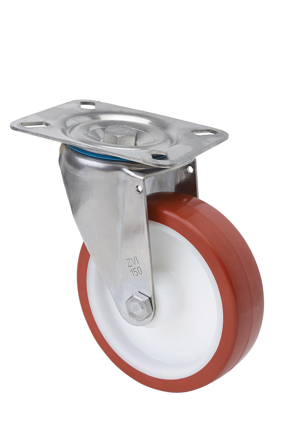 Rueda realizada en poliuretano y acero inoxidable de 80 mm de diámetro. Soporta un peso aproximado de 100 kg y tiene un sistema de fijación de pletina giratoria