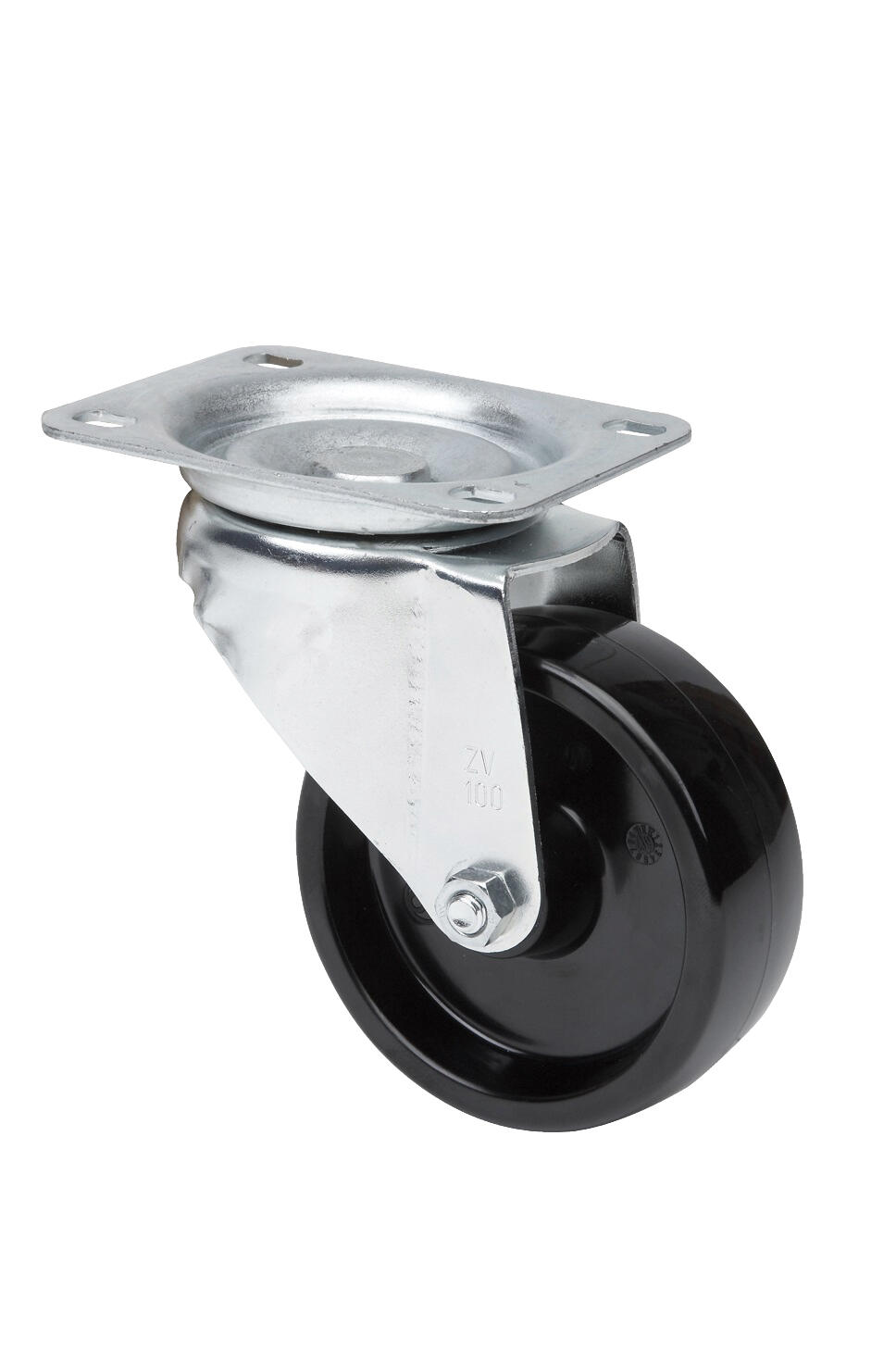 Rueda realizada en resina de poliuretano de 100 mm de diámetro. Soporta un peso aproximado de 125 kg. Fijación a través de pletina giratoria. Resina de alta temperatura