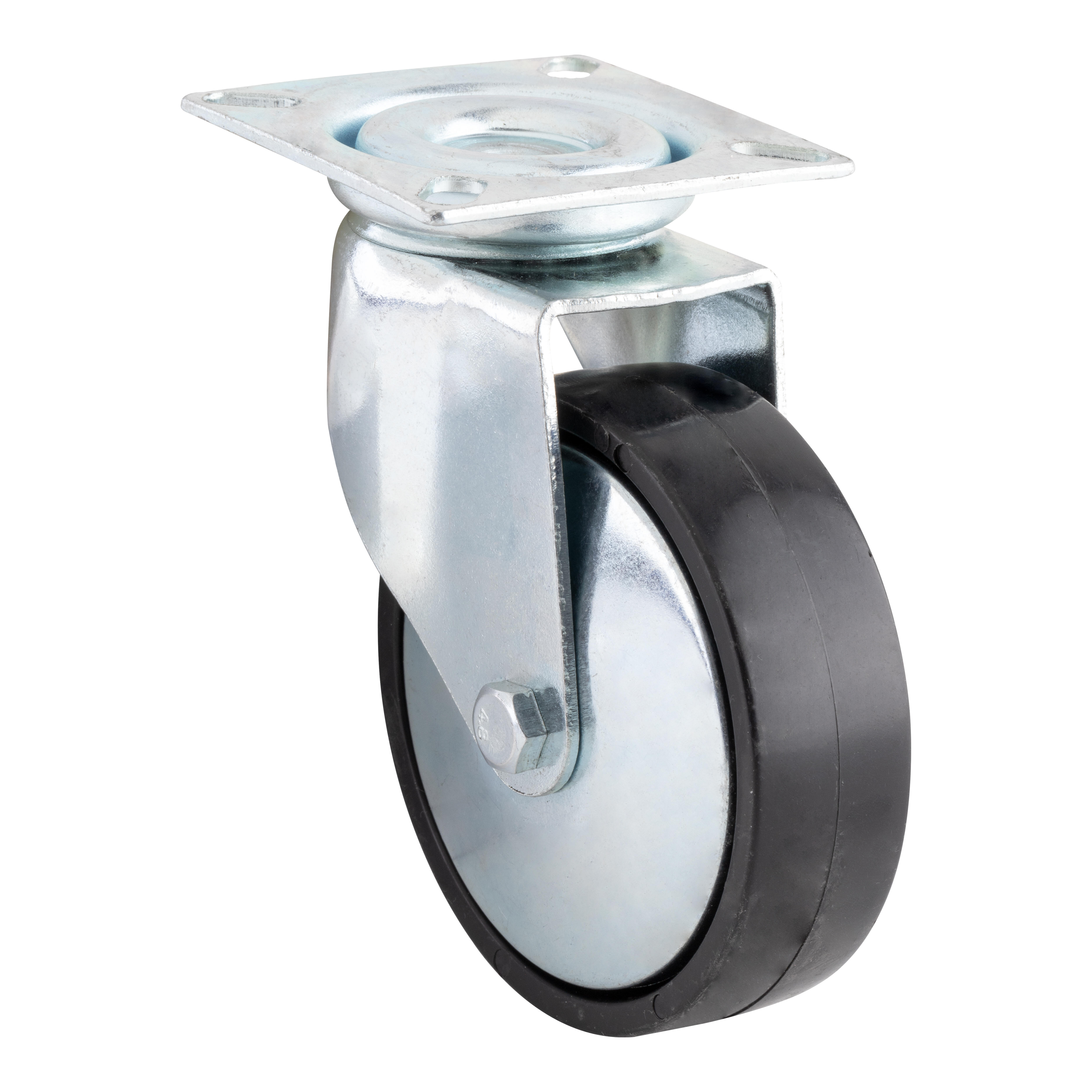 - Ventajas del producto: rueda construida con poliamida negra que proporciona una excelente durabilidad y resistencia al desgaste, incluye chapa de acero embutida con acabado cincado brillante que asegura una larga vida útil, sistema de doble rodamiento de bolas que facilita el giro y mejora la maniobrabilidad, capacidad de carga máxima de 60Kg, y diseño con agujero pasante y platina para una instalación segura y robusta.