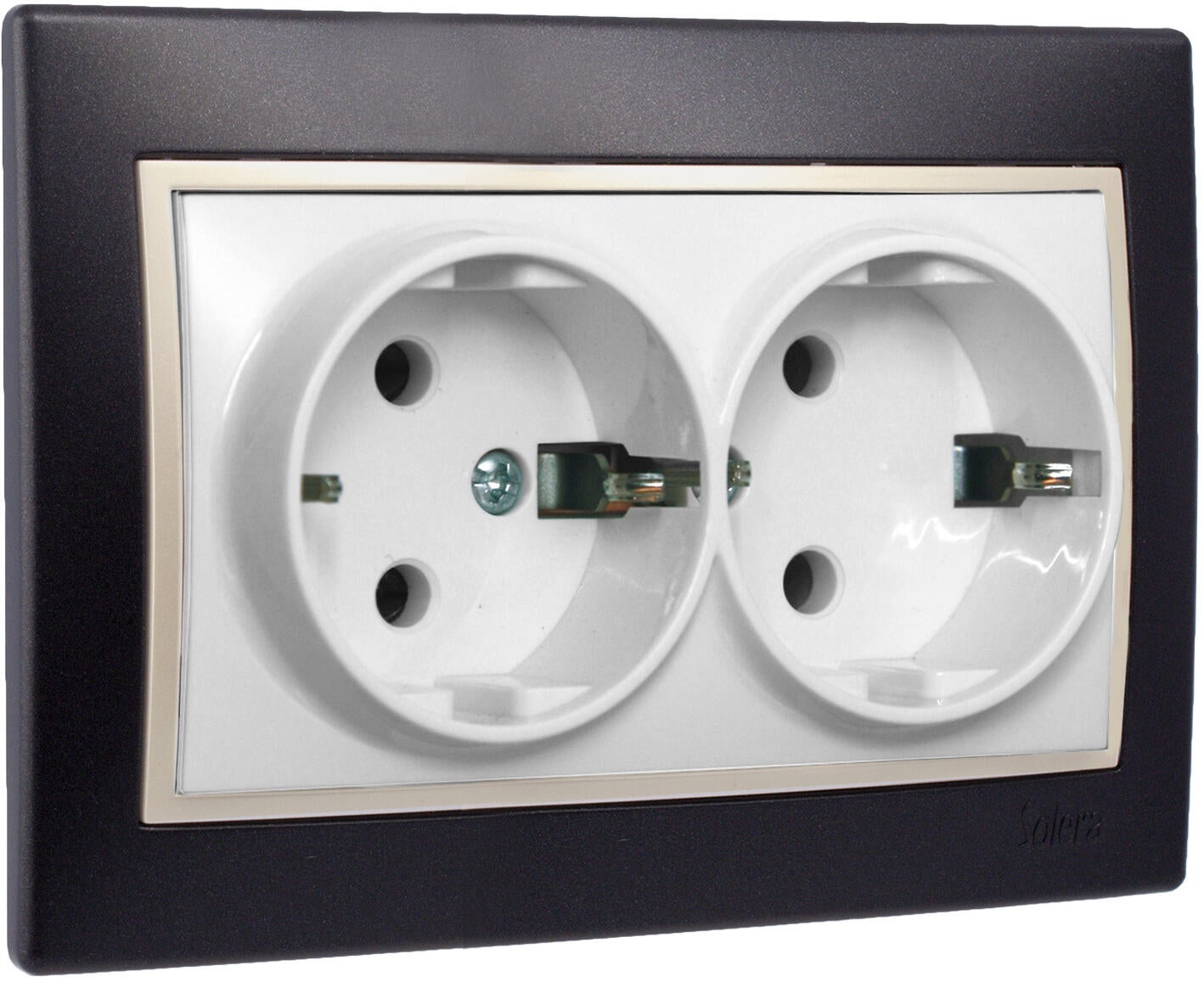 Base doble de enchufe 2P+T con obturador. 16A 250v. 117x81. Color negro. Mecanismos interruptores de 10A 250v. Tomas de corriente 16A 250v. Fabricado en policarbonato. Contactos en plata de alto poder de ruptura. Embornamiento por tornillos. Chasis zincado y enlazable de 1mm de espesor. Todos los materiales conductores estan fabricados en cusn94. Mecanismo completo.