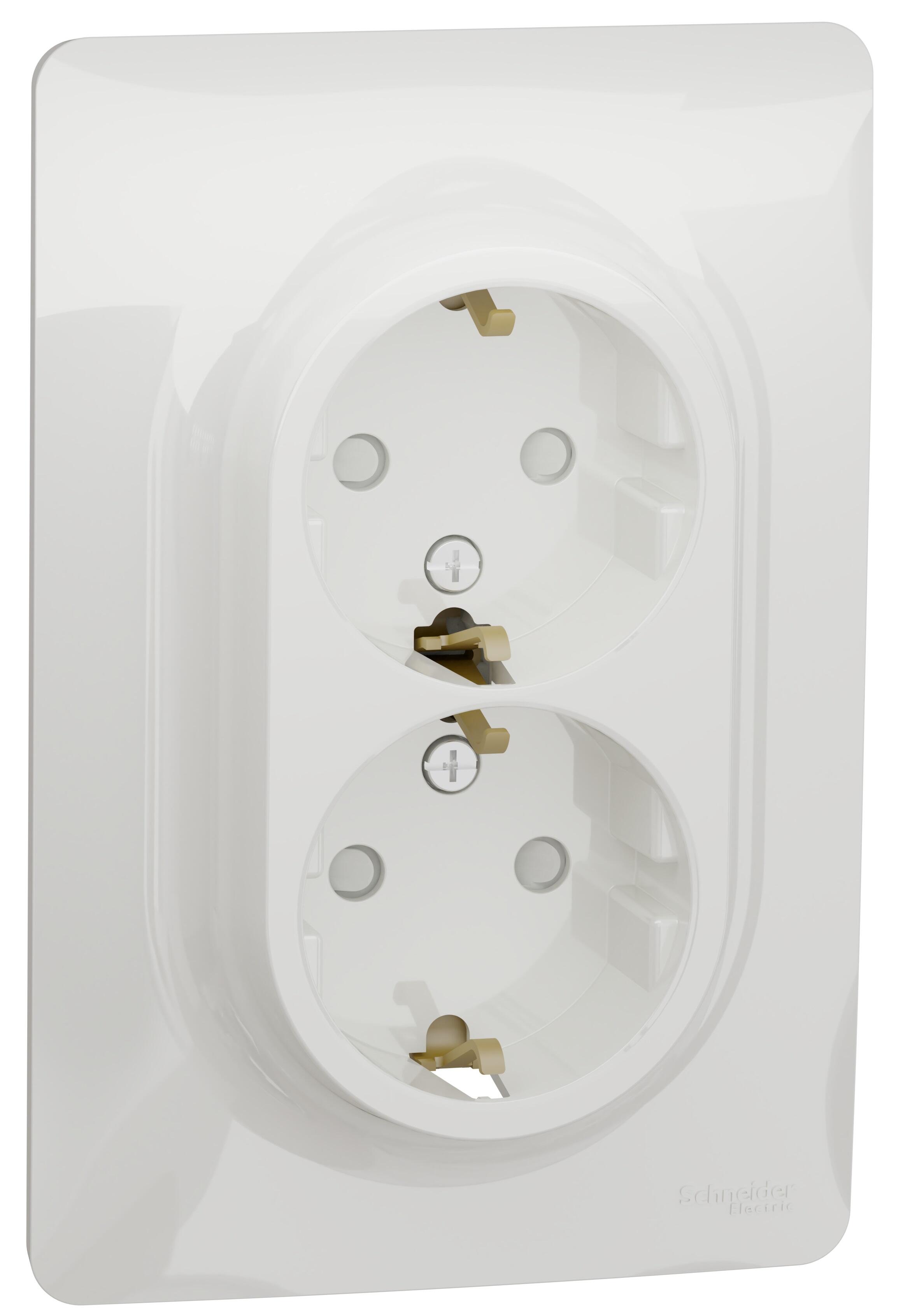 Base de enchufe schuko de 2 polos + toma de tierra doble de intensidad máxima 16A y 230vac, cableado por conexionado por tornillo. Acabado blanco polar de la serie New Unica de Schneider. La base doble se suministra con bastidor y marco incluido. Esta base de enchufe doble no es compatible para utilizar con marcos dobles, triples o cuadruples de distintos acabados de la serie New Unica.