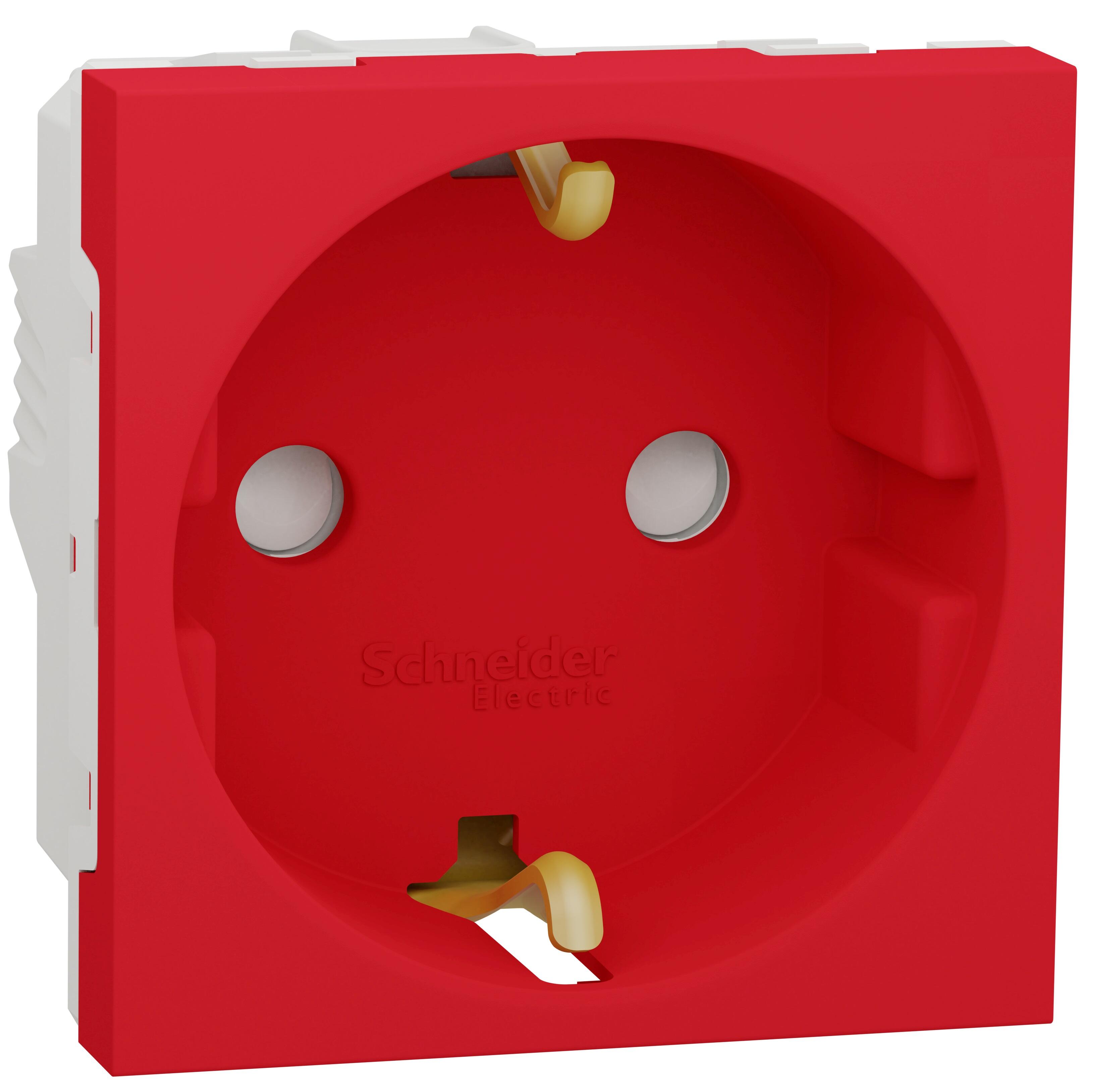 Base de enchufe schuko de 2 polos + toma de tierra de intensidad máxima 16A y 230vac, cableado por conexionado por tornillo. Acabado rojo de la serie New Unica de Schneider. La serie New Unica se compone por bastidor + mecanismo + marco. Para completar su instalación debe elegir el bastidor adecuado, y el marco para el acabado deseado, que se venden por separado. La serie New Unica de Schneider dispone de bastidor para caja cuadrada universal y rectangular y de marcos dobles, triples o cuadruples en distintos acabados para completar su instalación.