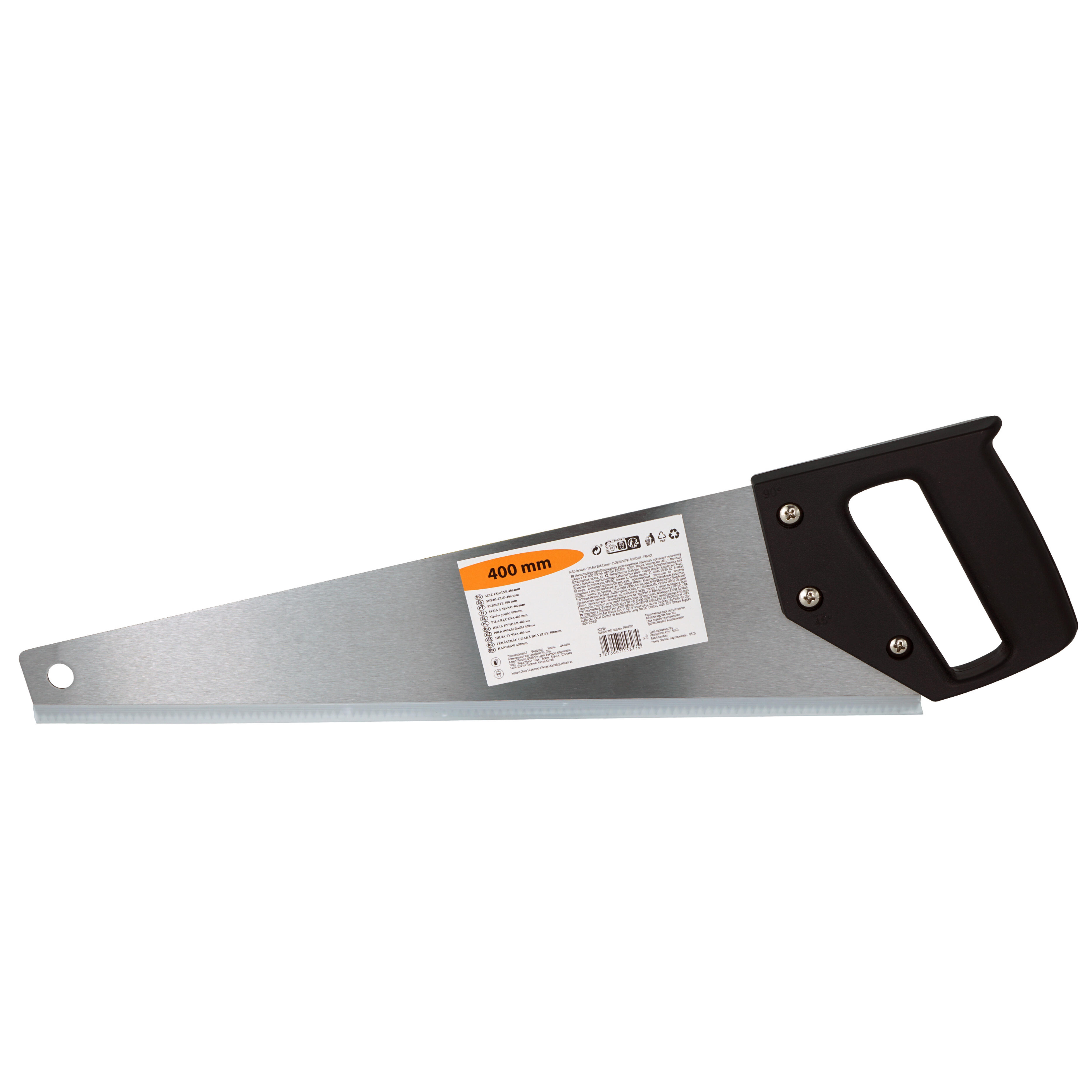 Sierra de mano de 400mm, hoja de acero y mango ABS color negro. Dientes perforados