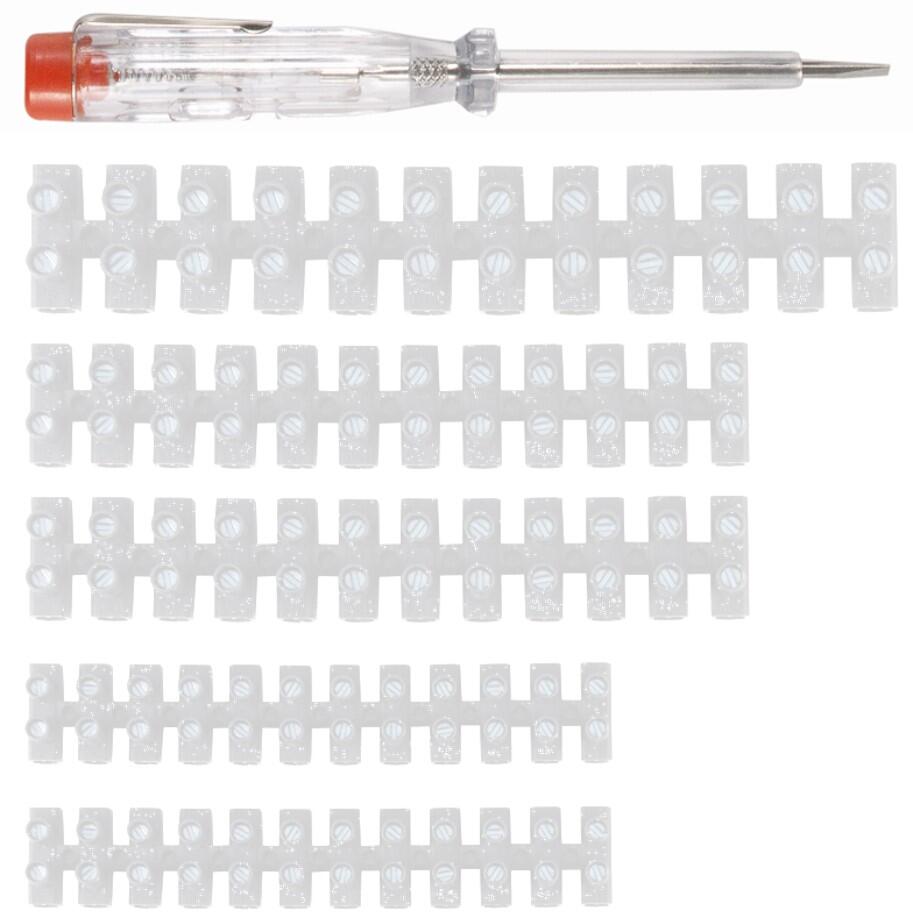 Kit formado por 5 regletas de conexión de 12 polos en color blanco (2ud de 4mm, 2ud de 6mm y 1ud de 10mm) y un tester buscapolos que está diseñado con un cabezal que permite su uso como destornillador de punta plana.