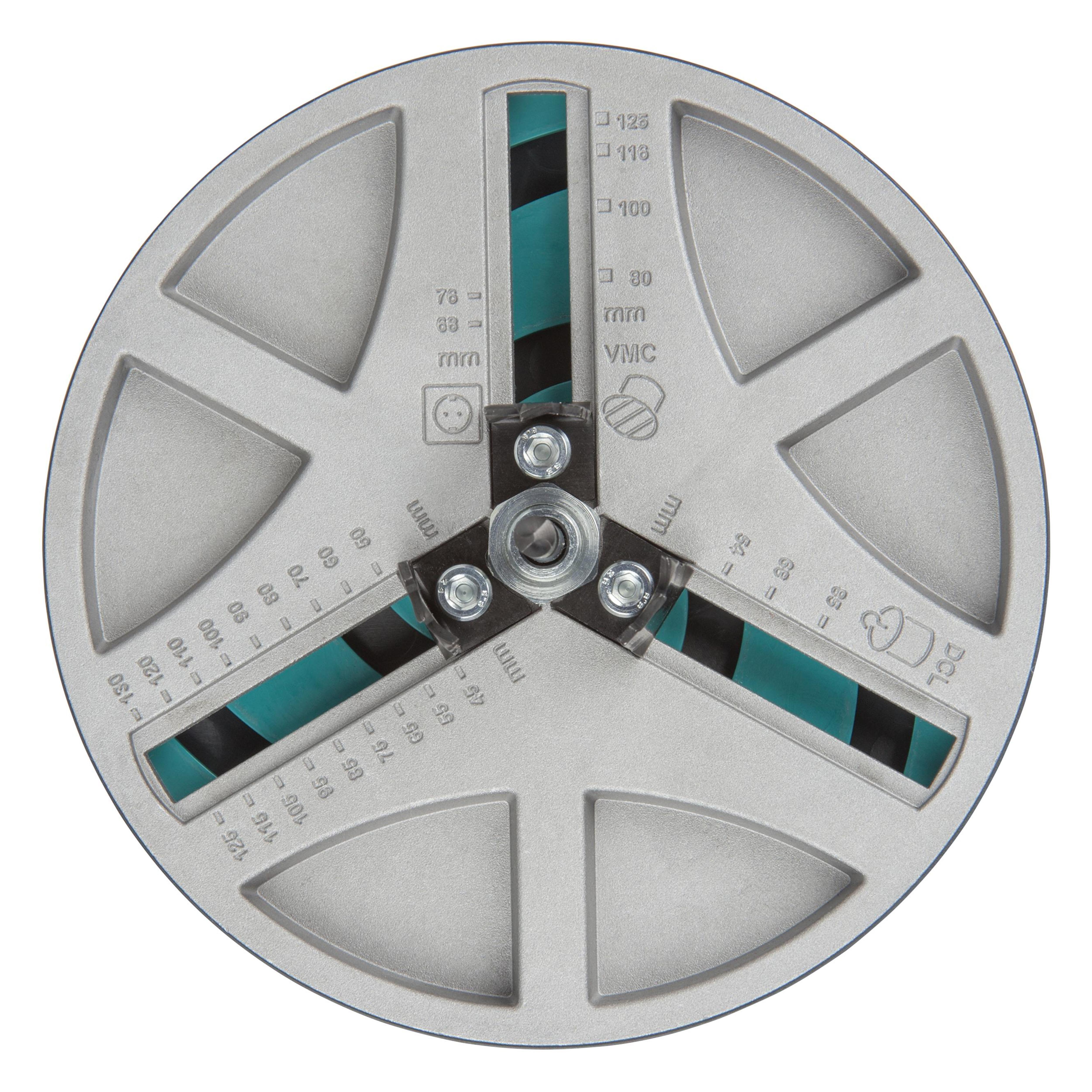 Sierra de corona ajustable para Ø 45 - 130 mm. Permite serrar distintos diámetros con solo un producto. Ajuste continuo en 3 pasos: aflojar, ajustar de forma sincronizada, fijar, rápido y sencillo. Los 3 grupos de 3 dientes y el dentado especial trabado procuran cortes finos y limpios. La escala milimétrica integrada y otras escalas para diámetros de montaje comunes para garantizar una orientación rápida. Gran plato de perforación protege la zona de trabajo. Grandes aberturas en el plato de perforación para una extracción fiable del polvo.