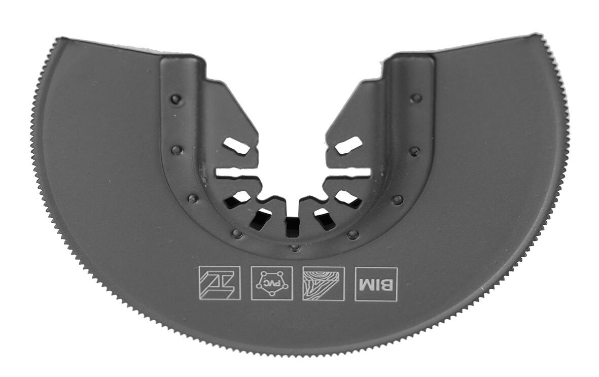 Sierra semi circular BIM (Bimetálica) para multi herramientas oscilantes. Inserción abierta plana, acoplamiento fácil y rápido a la herramienta sin necesidad de herramientas adicionales. Accesorio especialmente diseñado para cortes en metal, madera con clavos, plásticos y maderas duras. Especialmente indicada para cortes en zonas de difícil acceso, cortes enrasados, repaso de bordes, cantos y perfiles. Medidas 88 x 65 mm.