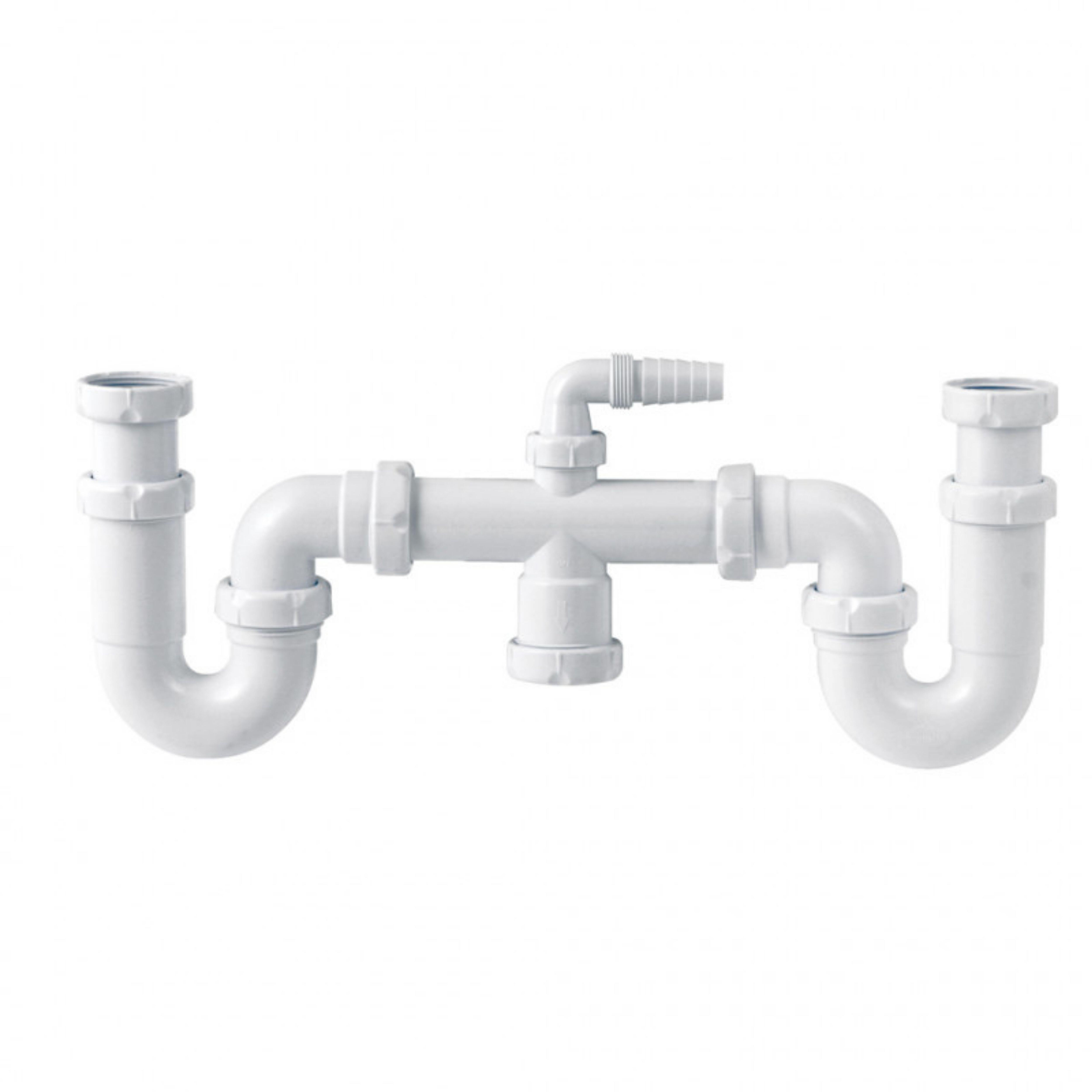 Sifón botella. Salida horizontal con doble racor extensible y toma de electrodomésticos (tuercas locas). Se suministra con junta 1 1/2" x ø 32 mm para reducir la salida de 1 1/2" a 1 1/4".