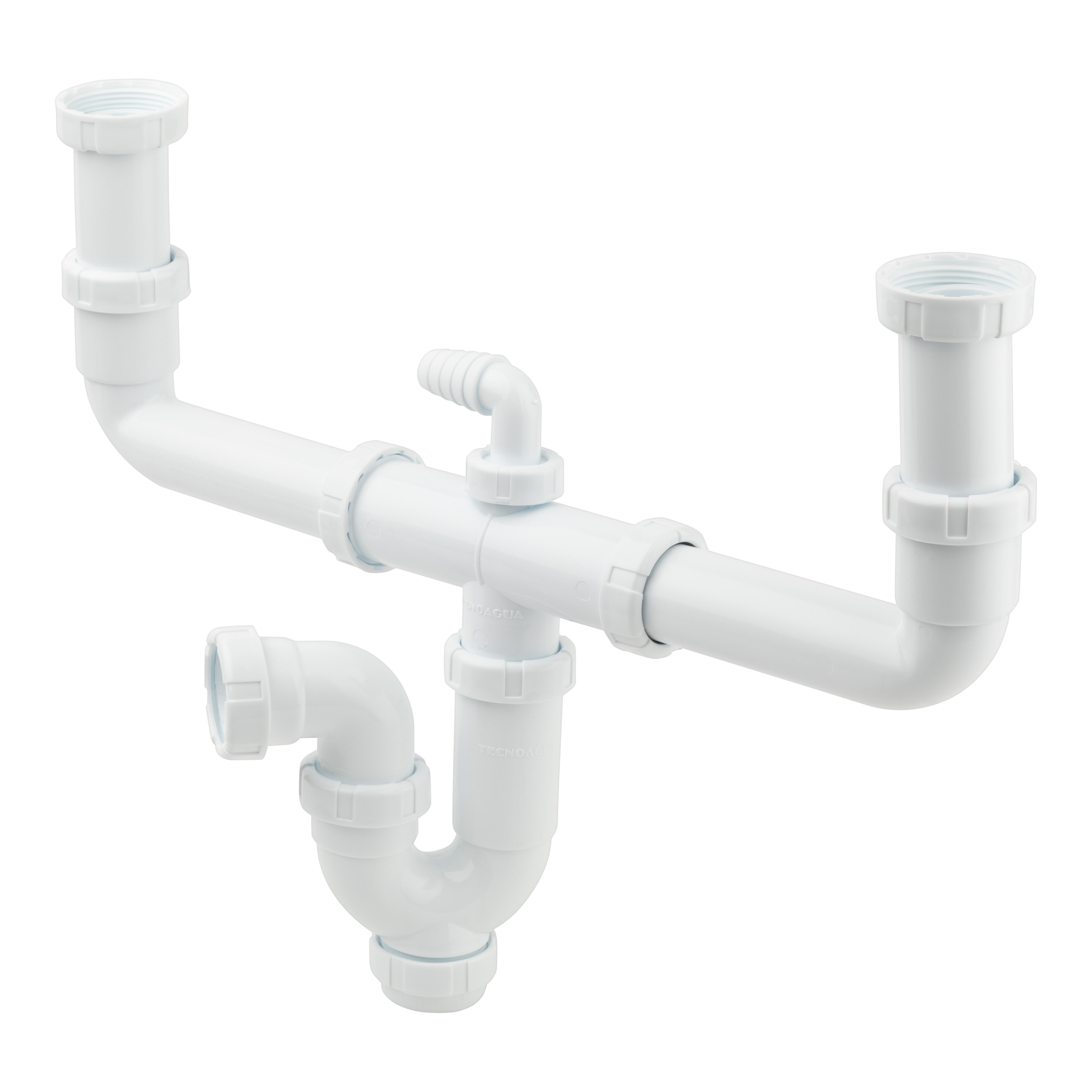 Sifón fregadero curvo extensible, de diámetro 40mm (1 1/2") en color blanco, con tuercas locas. Salida horizontal.
