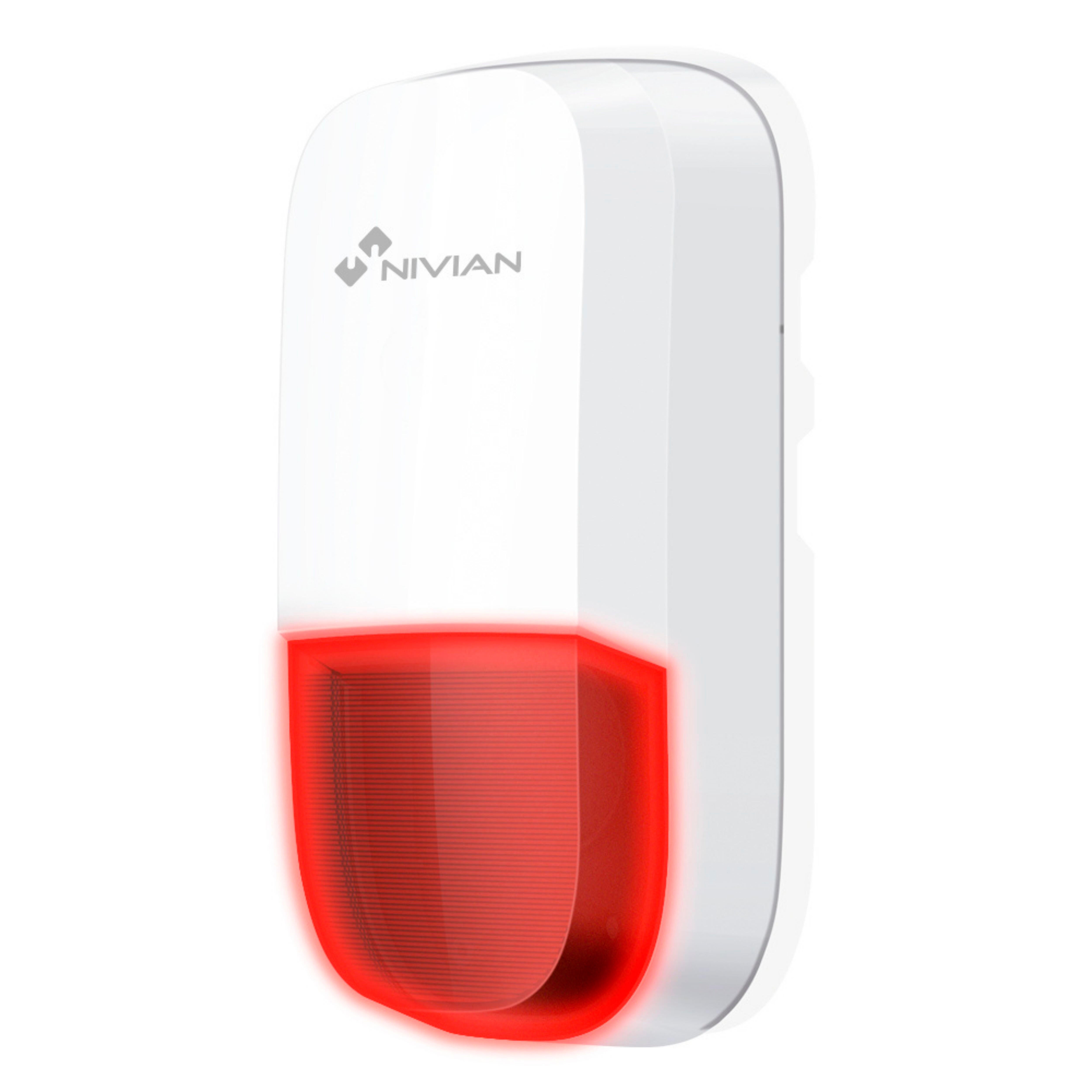 Sirena inalámbrica para exteriores. Dispone de alarma de 95 dB, batería de respaldo y luz de aviso. Alimentación CC 12V 1A. Batería de respaldo incluida.