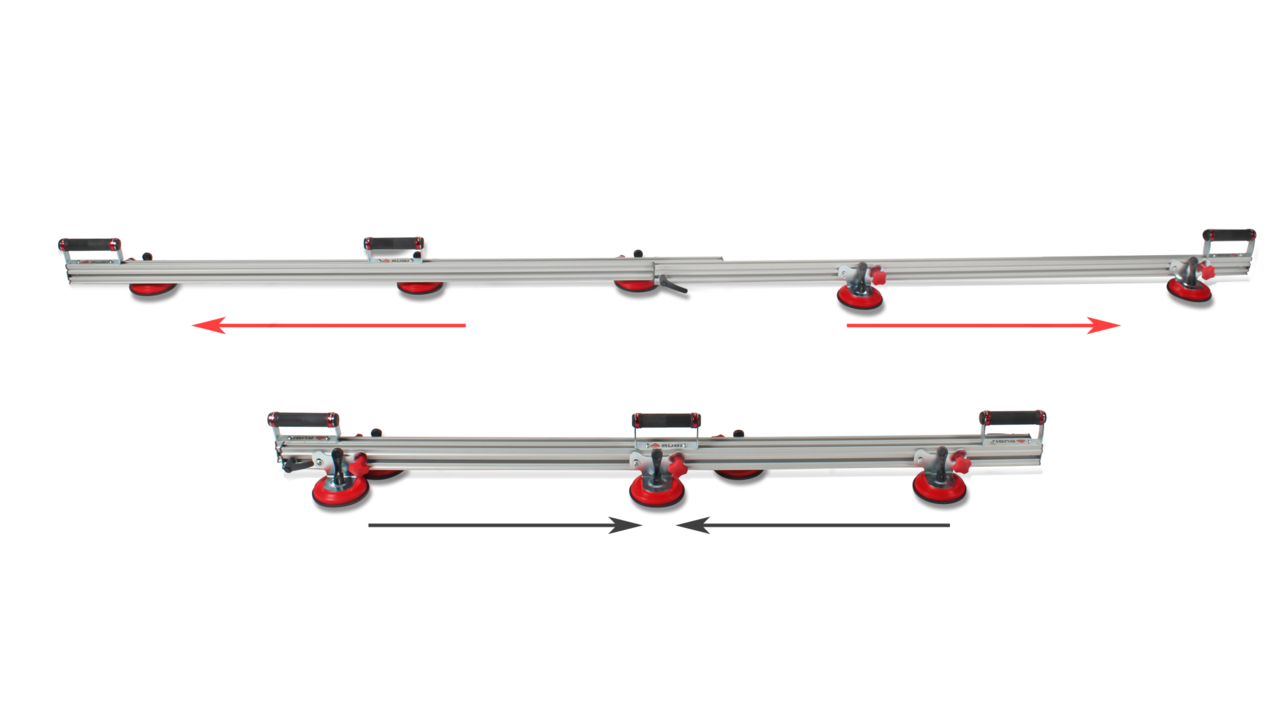 Sistema de transporte para láminas porcelánicas de gran formato. Incluye dos guías retráctiles y ajustables de 160 a 320 cm y 10 ventosas de sujeción. Carga máxima conjunto: 60kg. Para piezas de hasta 3 m