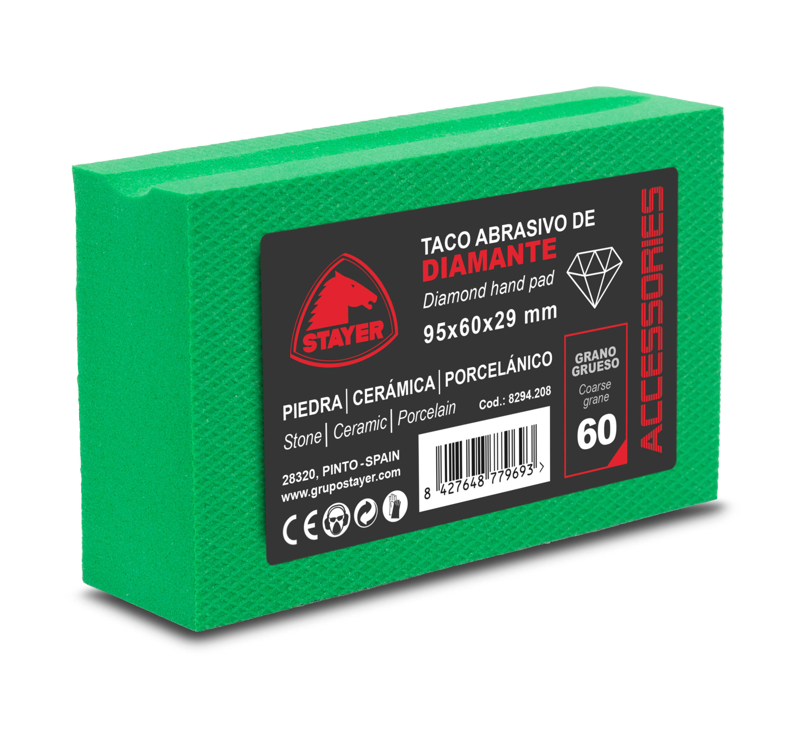 Taco diamantado para lijado y pulido manual. Taco de espuma de alta densidad, agarre cómodo y seguro dando suficiente resistencia a la capa abrasiva como para rectificar superficies. Medidas 95 x 60 x 29 mm. Grano 60. Accesorio especialmente diseñado para lijado en materiales cerámicos, vidrio, mampostería, fibra de vidrio, plásticos y adhesivos duros. Especialmente indicado para perfilar y lijar bordes,