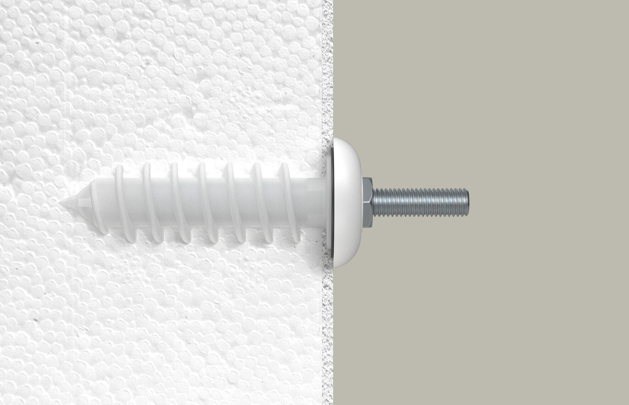 La instalación se realiza sin necesidad de herramientas especiales. La rosca en espiral se atornilla directamente en el panel aislante. Para la instalación en paneles aislantes de fibra de madera, es necesario un pretaladrado del panel con una broca de 16 mm. En instalaciones previas al enlucido, la varilla roscada se protege mediante una funda tubular. La roseta de cubierta blanca incluida, con un disco de sellado de PE adherido, protege contra la humedad.