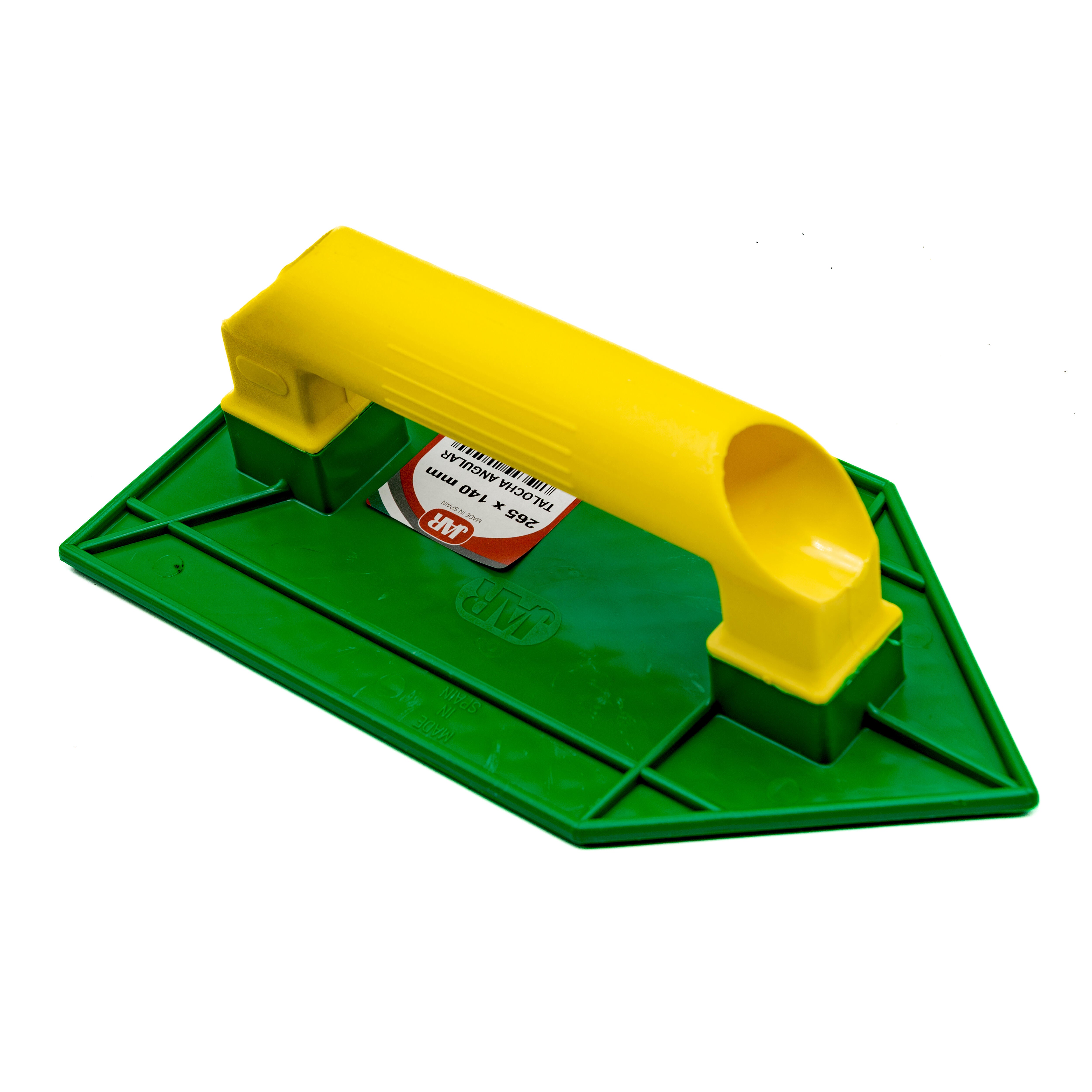Talocha punta 270x140mm. Poliestireno. Mango de plástico. La base de dicha pieza tiene un ligero relieve para que el acabado sea rugoso. Mango de plástico color amarillo redondeado y hueca por dentro. El espacio existente para introducir la mano es de: 3,5 cm. La parte longitudinal dispone de unas estrías antideslizantes para un mejor agarre y más cómodo manejo.