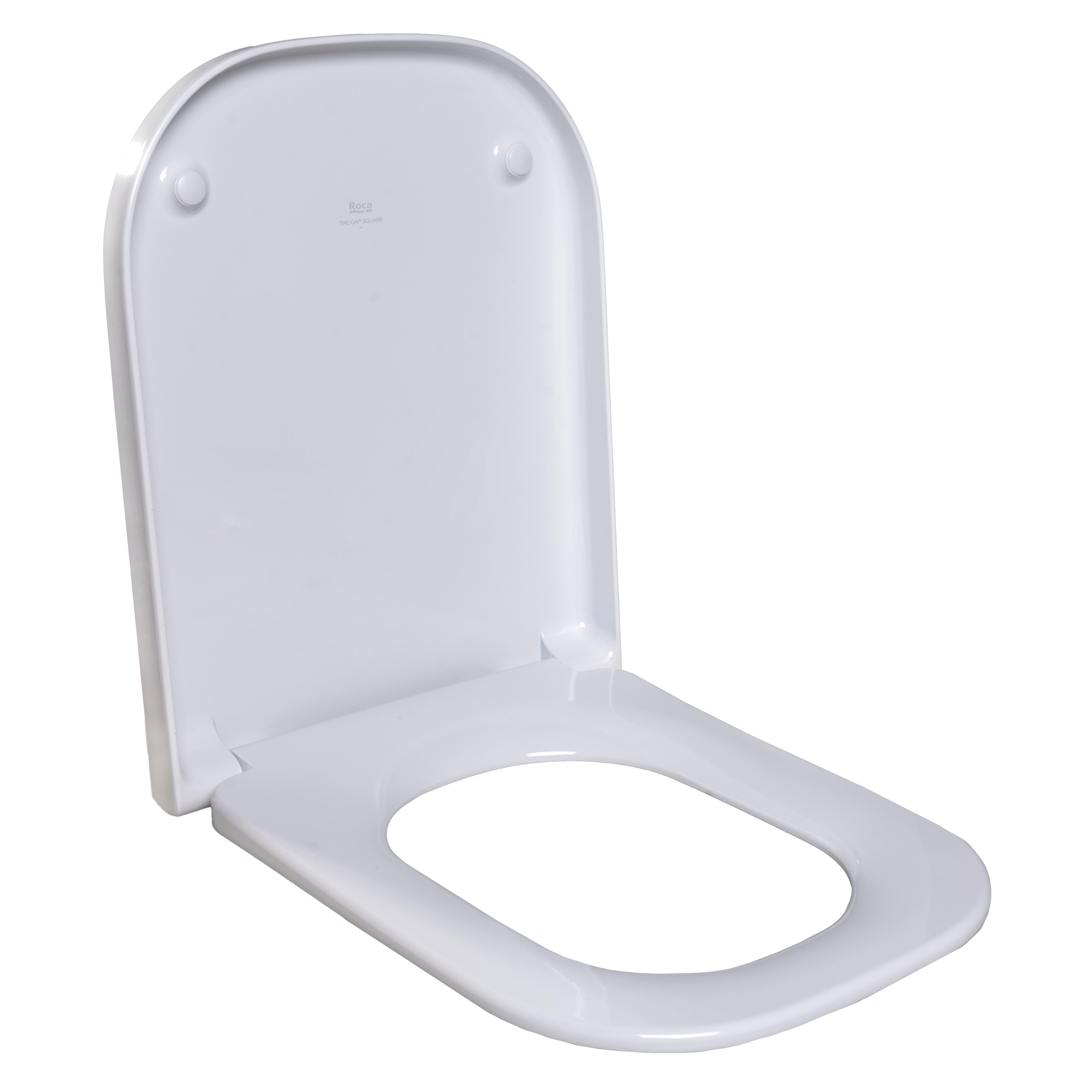 Tapa para WC de la serie GAP, con forma cuadrada, fabricada en Supralit. Con caída amortiguada. Bisagras en acero inoxidable, de fácil extracción para limpieza.