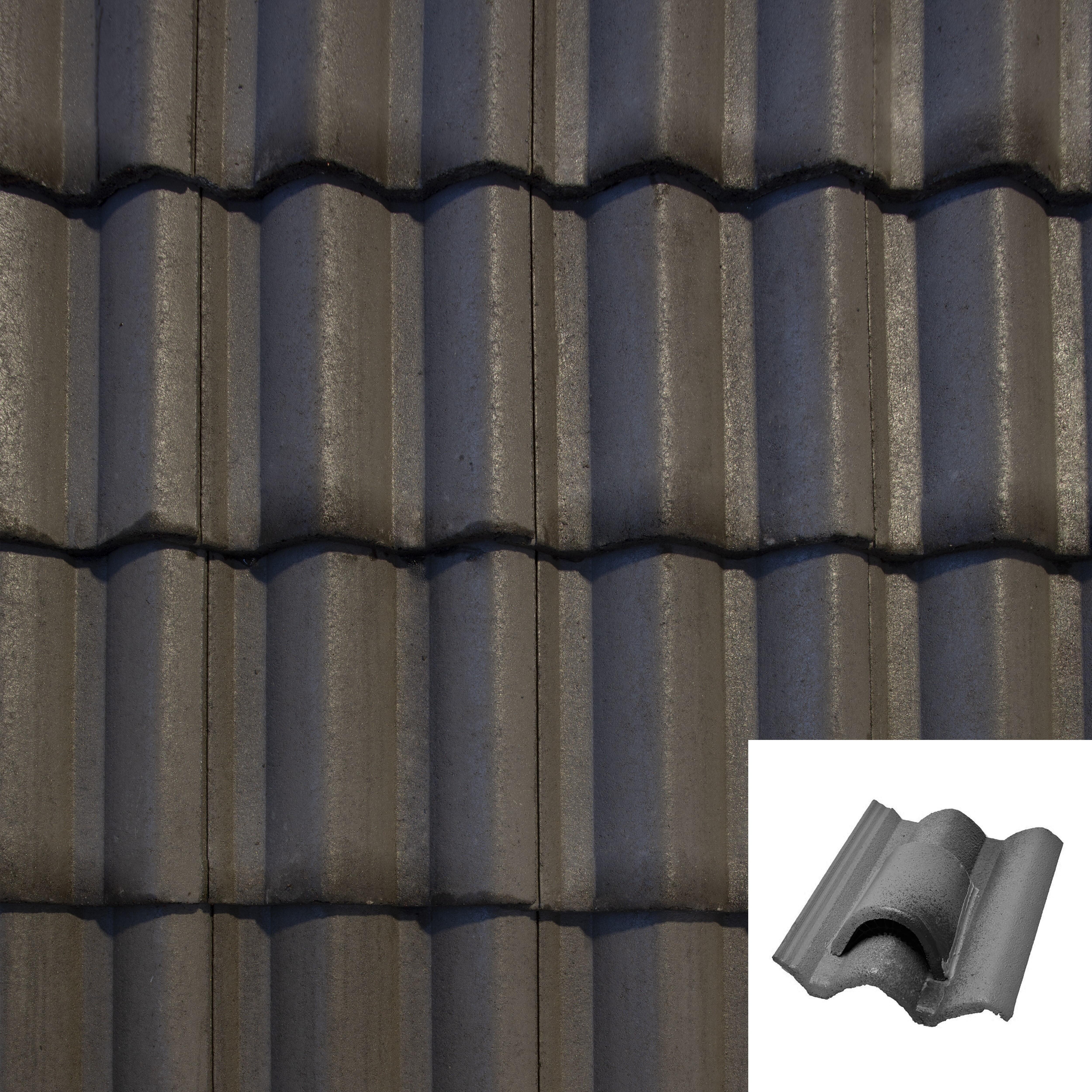Teja de ventilación de hormigón Gredos de color gris. Pieza realizada a partir de una teja Gredos, a la que se le realiza un orificio en la zona central, que permita la entrada de aire en el interior de la cubierta. Posteriormente, se protege dicho orificio para impedir el paso del agua de lluvia. La entrada de aire minimiza la aparición de condensaciones y humedades bajo las tejas. Contribuye a nivelar la temperatura exterior e interior de las tejas.