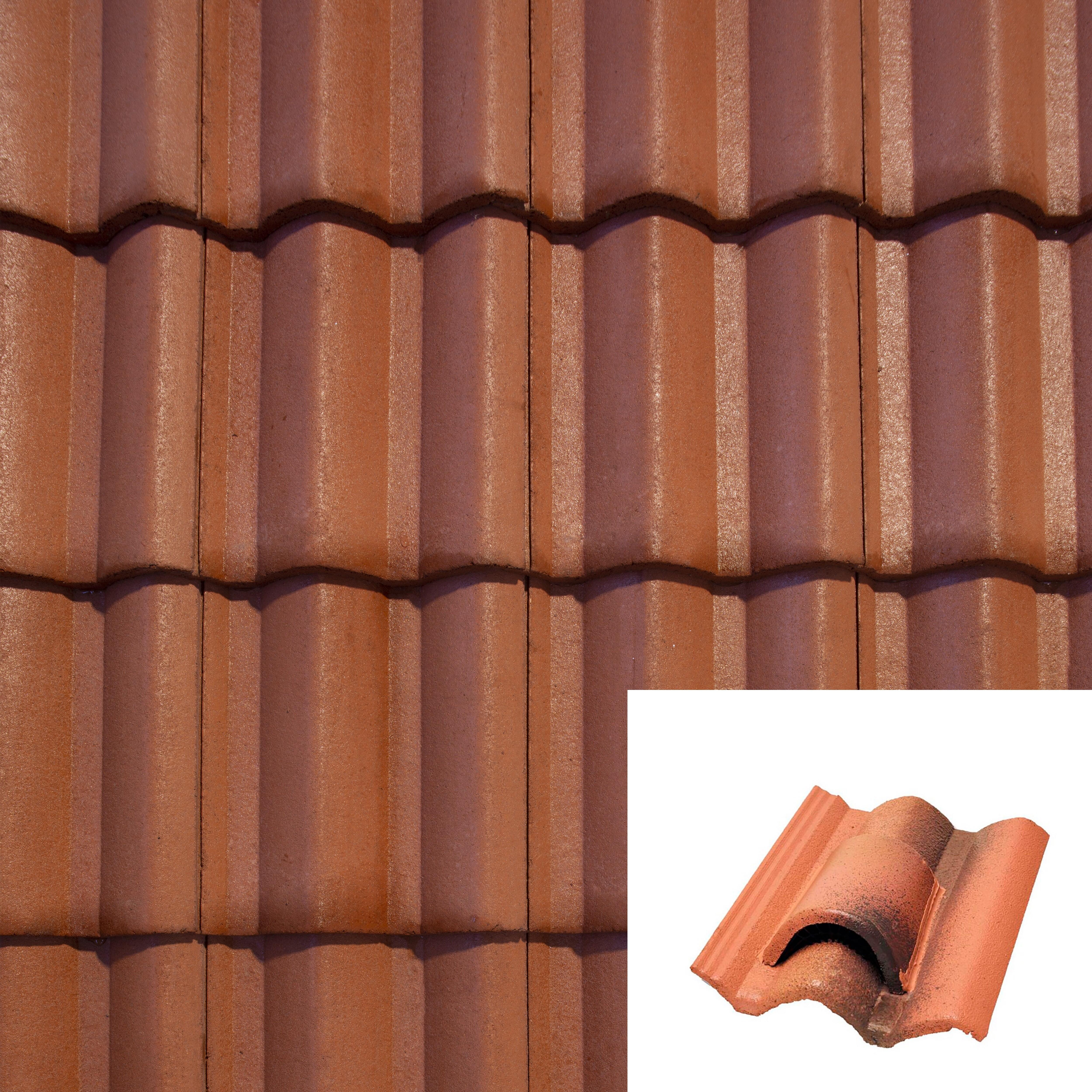 Teja de ventilación de hormigón Gredos de color rojo. Pieza realizada a partir de una teja Gredos, a la que se le realiza un orificio en la zona central, que permita la entrada de aire en el interior de la cubierta. Posteriormente, se protege dicho orificio para impedir el paso del agua de lluvia. La entrada de aire minimiza la aparición de condensaciones y humedades bajo las tejas. Contribuye a nivelar la temperatura exterior e interior de las tejas.