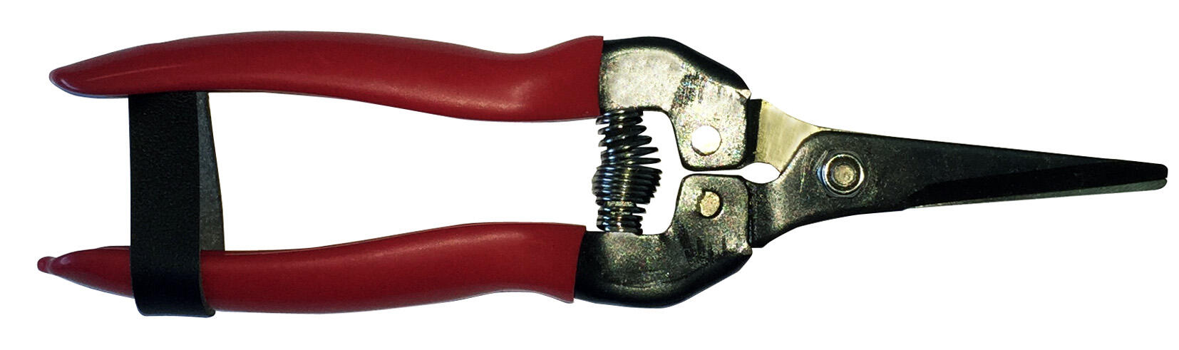 Tijera de recolección de punta recta para una mano con tope de cierre. Corte preciso y limpio. Máximo diámetro de corte 4mm. Está fabricada en material de acero. Es ideal para su utilización en el huerto y jardín, muy utilizada para la poda de brotes verdes, gracias a su comodidad y precisión de poda.