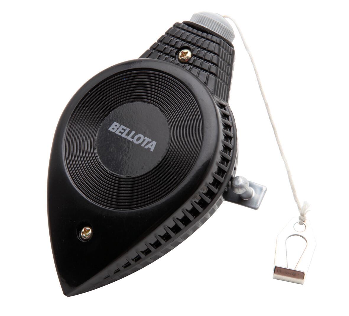 Tiralíneas con carcasa de aluminio para marcaje. Forma ergonómica y compacta. Cuerda de 30m. Manivela para bloquear la cuerda. Gancho de acero para la fijación en diferentes superficies. Peso: 230gr.