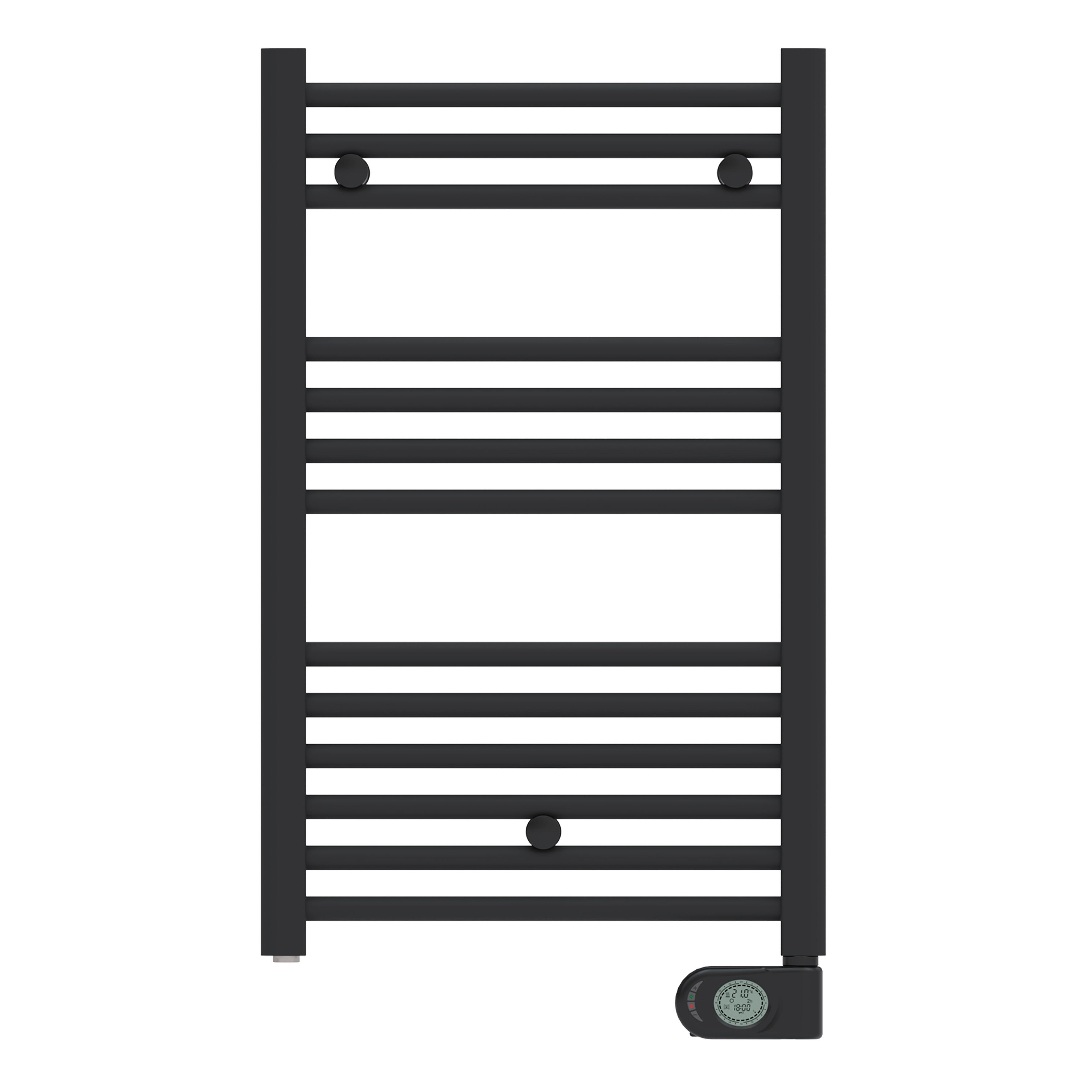 Toallero eléctrico programable de 400W en negro mate. Fabricado en acero, con inercia líquida. Termostato digital con pantalla LCD, con programación diaria/semanal. Con 5 modos: Confort, Noche, Antihielo, standby y boost 2h. Función ventanas abiertas.