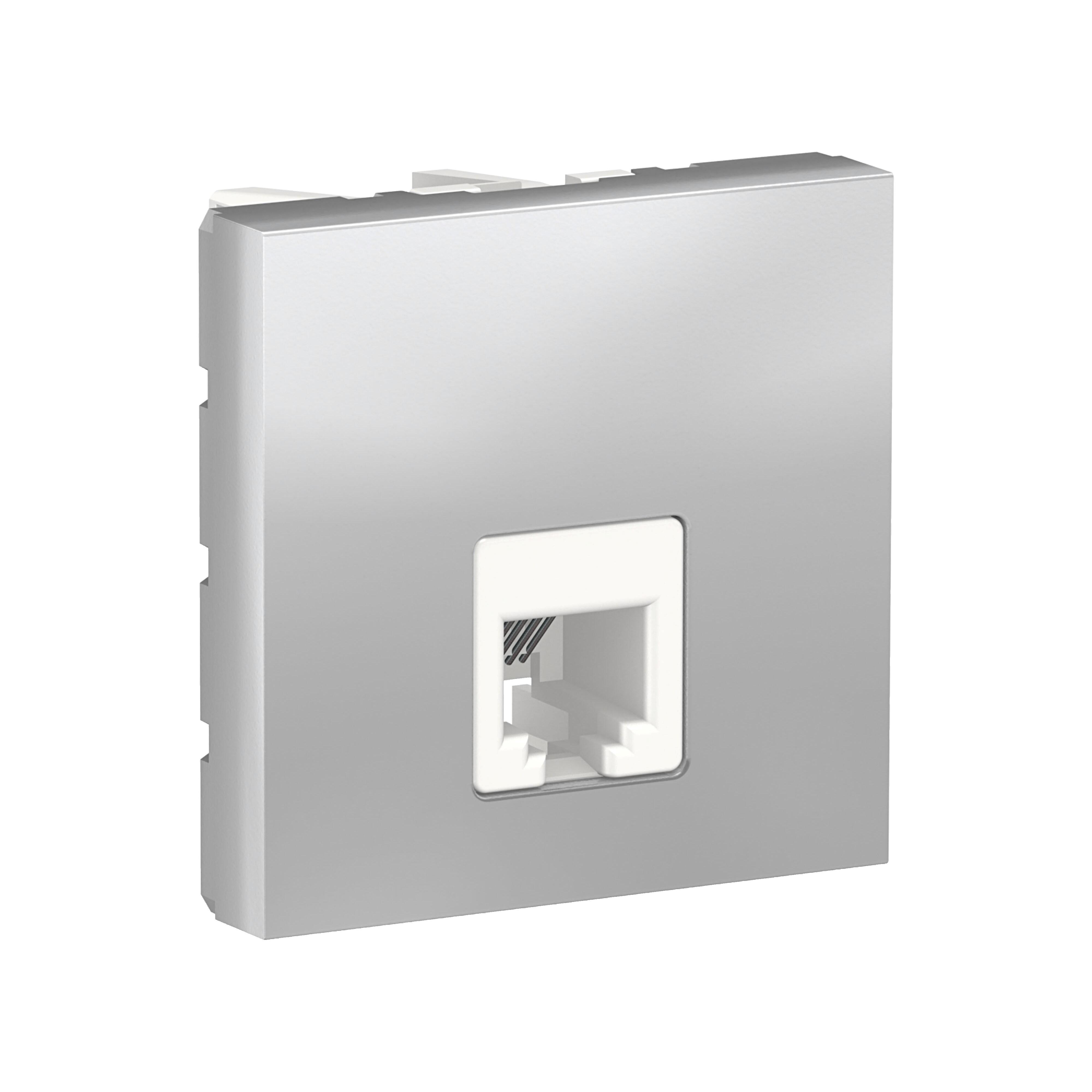 Toma de teléfono RJ12-6 hilos ancho. Acabado aluminio de la serie New Unica de Schneider. La serie New Unica se compone por bastidor + mecanismo + marco. Para completar su instalación debe elegir el bastidor adecuado, y el marco para el acabado deseado, que se venden por separado. La serie New Unica de Schneider dispone de bastidor para caja cuadrada universal y rectangular y de marcos dobles, triples o cuadruples en distintos acabados para completar su instalación.