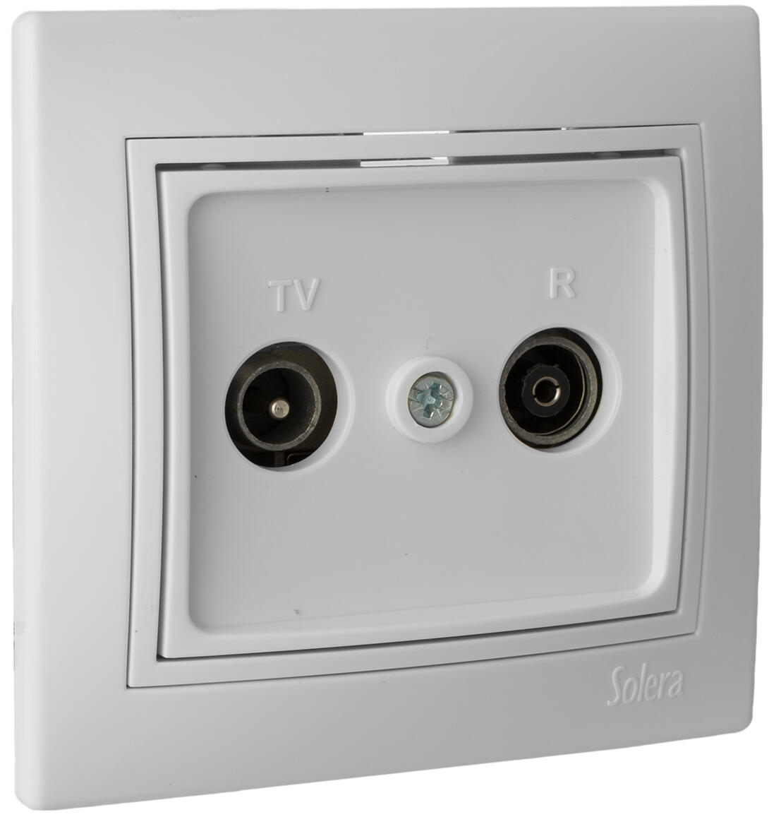 Toma final de tv y radio. 83x81. Color blanco. Mecanismos interruptores de 10A 25v. Fabricado en policarbonato. Contactos de plata de alto poder de ruptura. Embornamiento por tornillos. Chasis zincado y enlazable de 1mm de espesor. Todos los materiales conductores estan fabricados en cusn94.