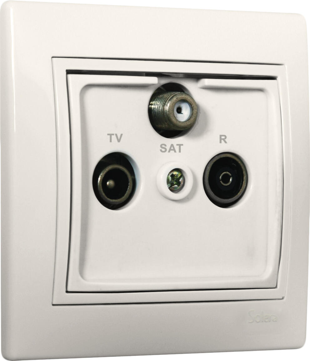 Toma final de satélite, tv y radio. 83x81. Color blanco. Mecanismos interruptores de 10A 25v. Tomas de corriente de 16A 250v. Fabricado en policarbonato. Contactos de plata de alto poder de ruptura. Embornamiento por tornillos. Chasis zincado y enlazable de 1mm de espesor. Todos los materiales conductores estan fabricados en cusn94.