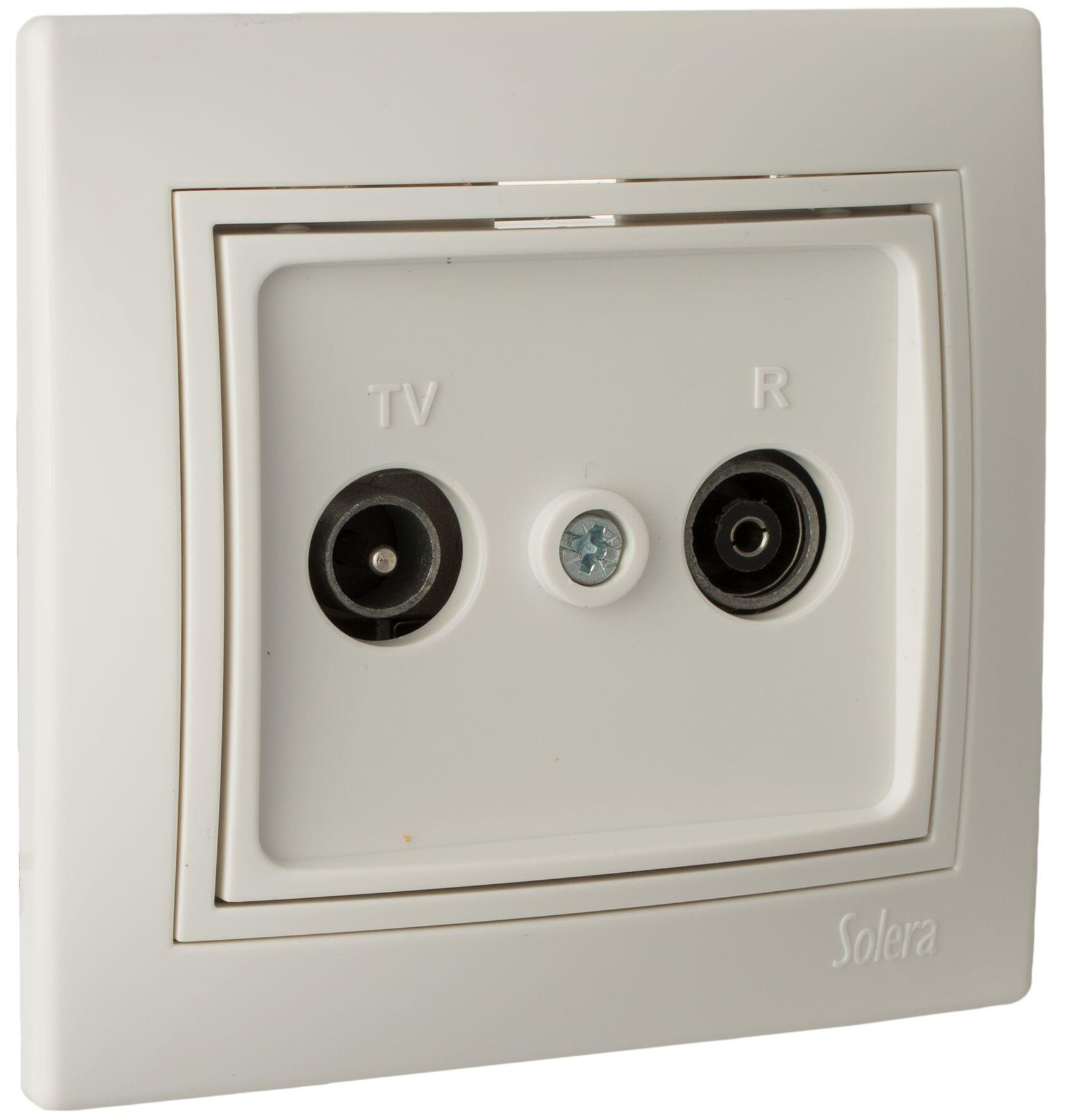 Toma de tv y radio. 83x81. Color blanco. Mecanismos interruptores de 10A 25v. Tomas de corriente de 16A 250v. Fabricado en policarbonato. Contactos de plata de alto poder de ruptura. Embornamiento por tornillos. Chasis zincado y enlazable de 1mm de espesor. Todos los materiales conductores estan fabricados en cusn94.