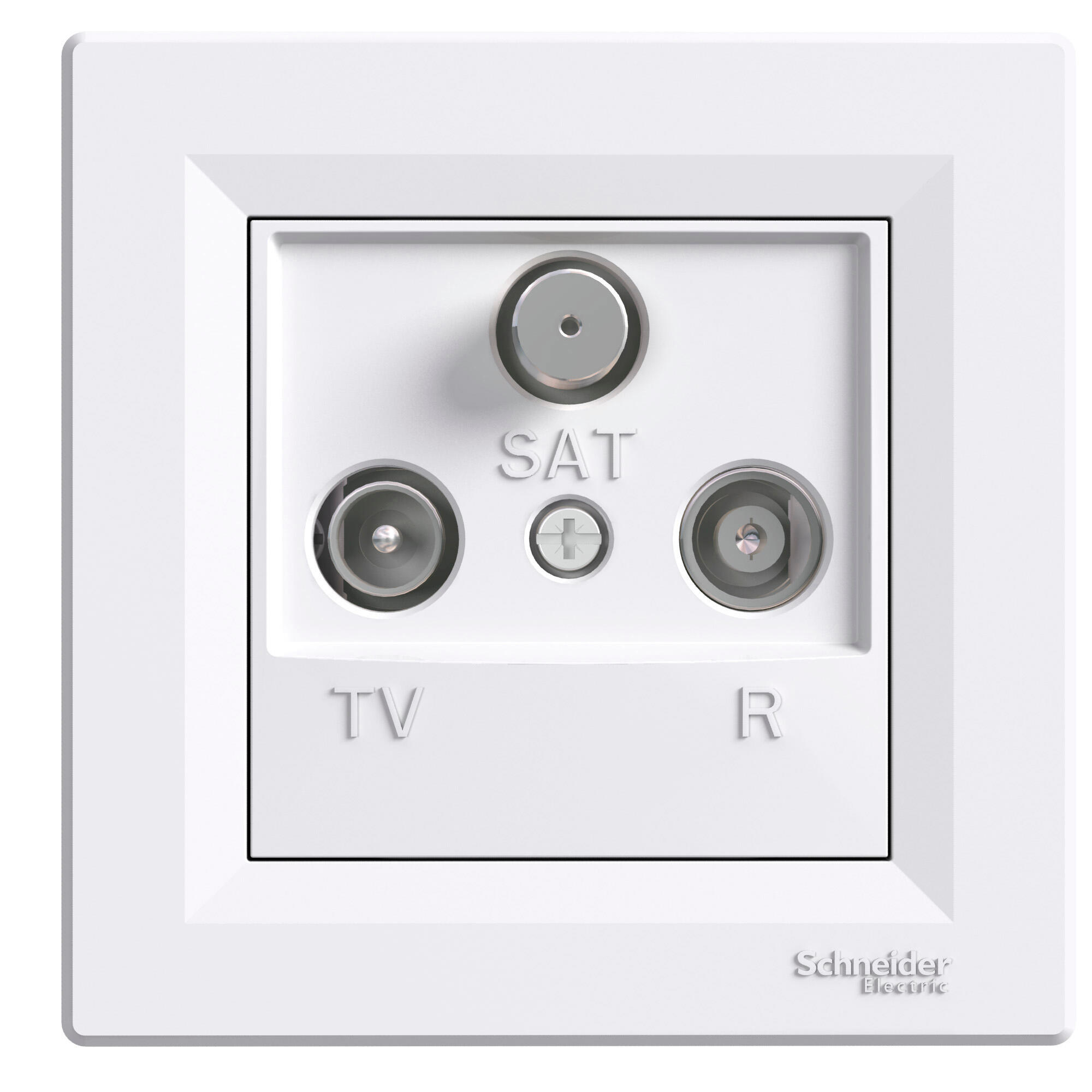 Toma de televisión y satélite intermedia monobloc. Acabado blanco de la serie Asfora de Schneider. La serie Asfora se suministra en formato monobloc en el acabado blanco, mecanismo completo con marco simple blanco incluido. La serie Asfora de Schneider dispone de marcos dobles, triples o cuadruples en distintos acabados para completar su instalación.