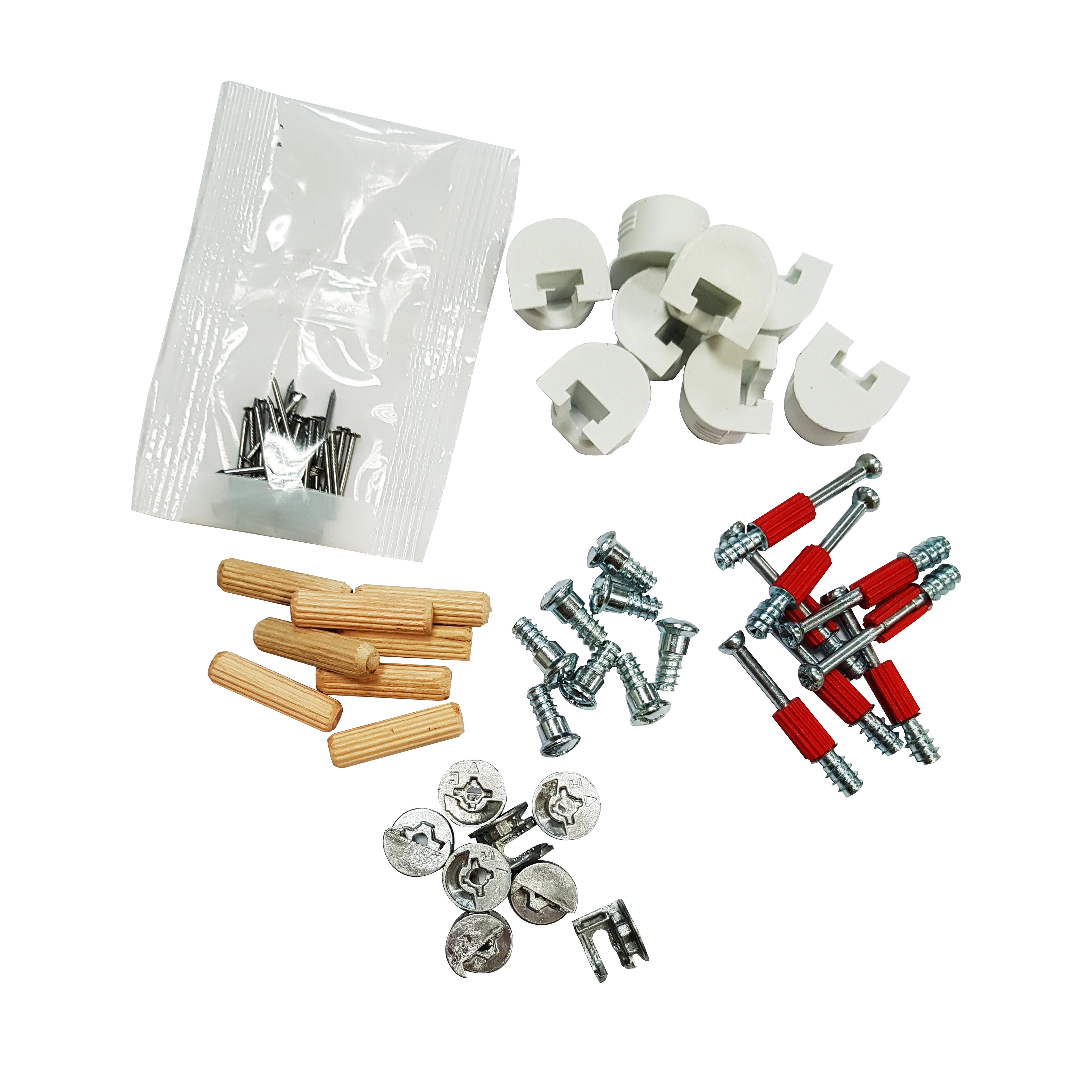 Se compone del conjunto de tornillos y excentricas necesarios para ensalblar un interior de arcmario de cualquiera de las medidas de nuestra gama. Este sistema fabricado en metal permite atornillar y desatornillar sin que sufra la madera que compone el kit. Además se incluyen soportes ocultos para la sujección e instalación de las baldas dentro del interior de armario.