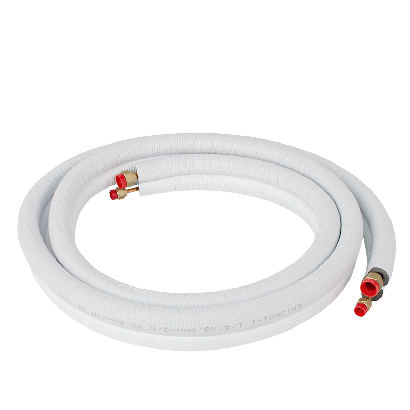 Rollo de 5 metros de tubo de cobre doble aislado, medidas 1/4" y 3/8". Aislamiento de polietileno de 6mm de espesor. Recomendado para instalaciones de aire acondicionado, compatible con todos los gases refrigerantes (R410A, R407C y R32). Terminales abocardados que facilitan su montaje.