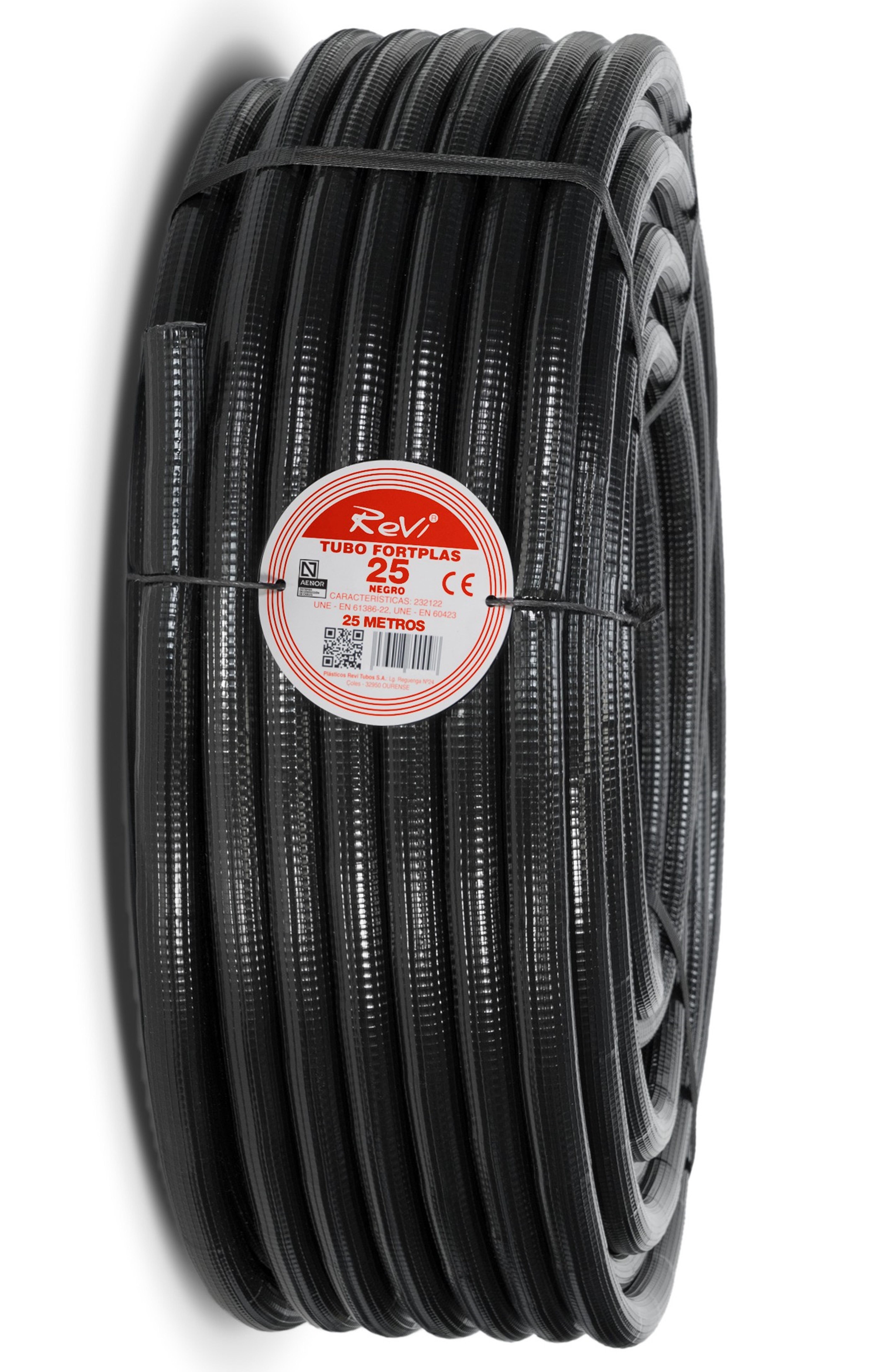 Tubo corrugado reforzado negro 25mm 25m. Adecuados para el montaje empotrado en paredes, techos para la protección de los conductores eléctricos. Doble capa siendo la interior de PVC rígido corrugado y la exterior de PVC flexible.