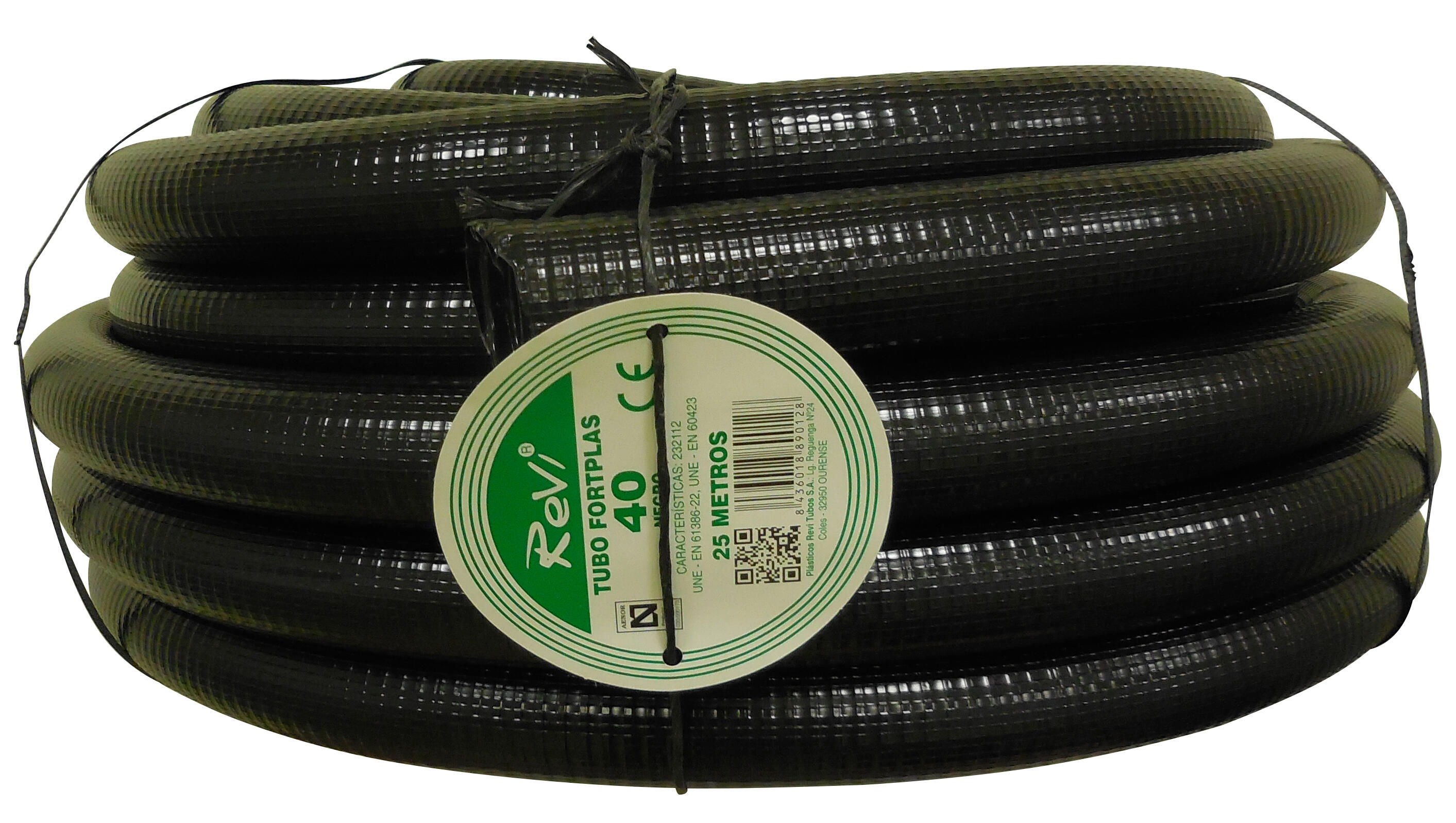 Tubo corrugado reforzado negro 40mm 25m. Adecuados para el montaje empotrado en paredes, techos para la protección de los conductores eléctricos. Doble capa siendo la interior de pvc rigido corrugado y la exterior de pvc flexible, resistencia impacto 2j.