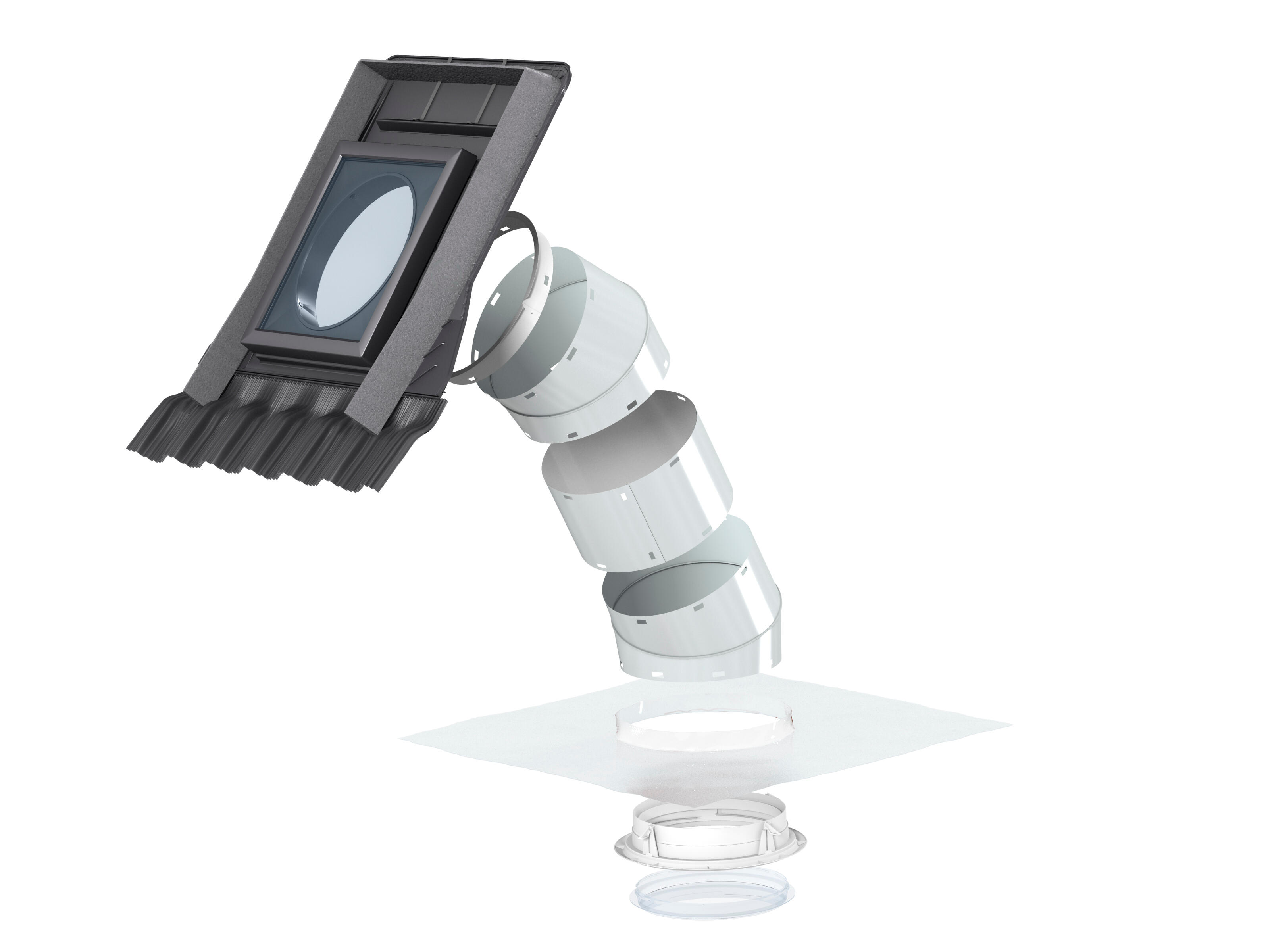 El tubo solar para cubierta inclinada está diseñado para proporcionar luz natural en lugares como pasillos, escaleras, baños…, bajo cubiertas inclinadas donde la instalación de una ventana de tejado no es posible. El tubo rígido es la solución perfecta cuando el hueco interior está situado justo debajo de la entrada de luz de la cubierta. El tubo solar incluye dos codos de 45 grados para ajustar la trayectoria del tubo. El módulo exterior del tejado está compuesto por un vidrio templado de 4 mm y un marco desmontable.