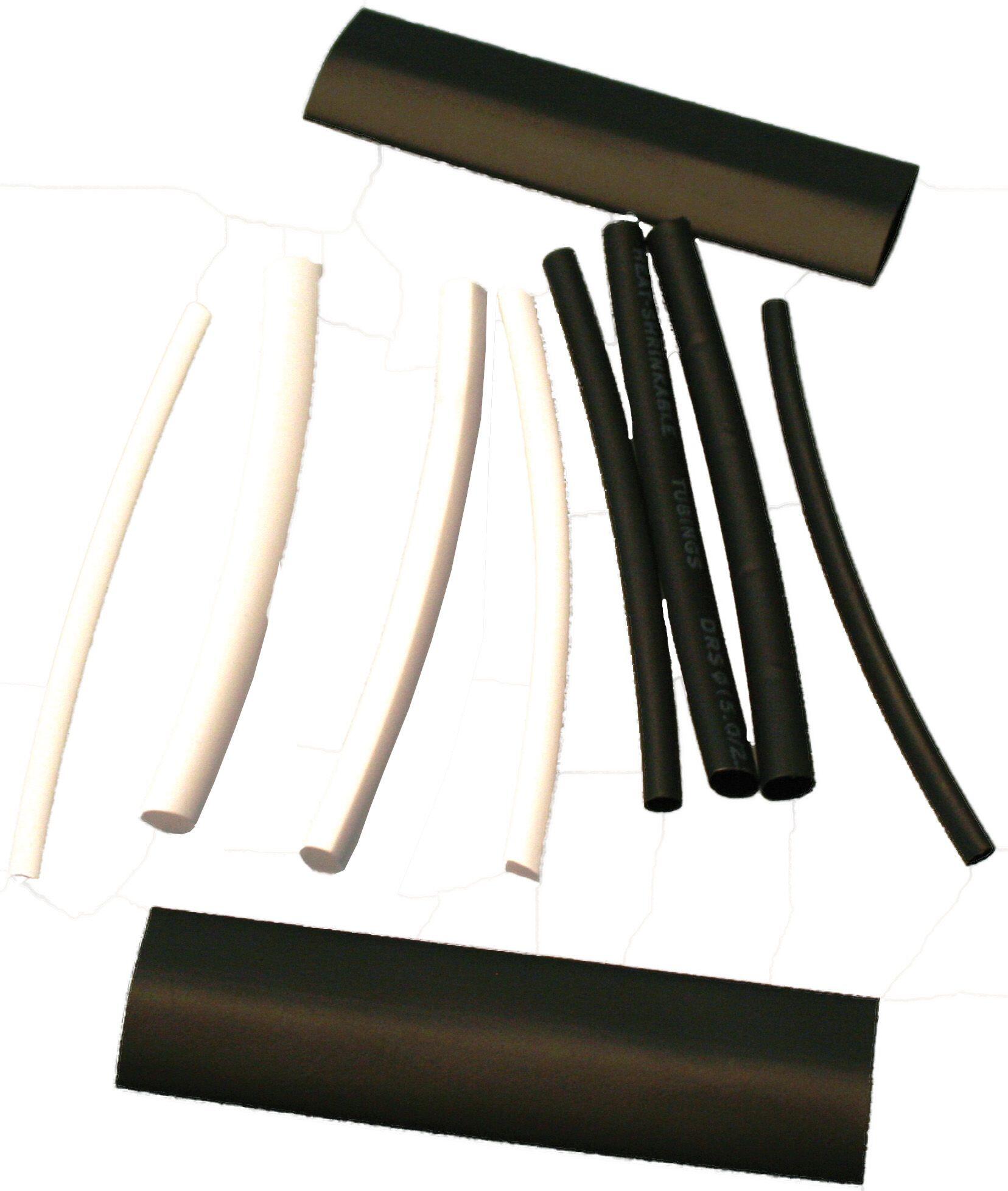 Surtido de 10 tubos termoretráctiles de 8 cm de longitud. Contiene: color blanco: 2 unidades ø 3,5 mm y 2 unidades ø 5 mm. Color negro: 2 unidades ø 3,5 mm, 2 unidades ø 5 mm y 2 unidades ø 13 mm.