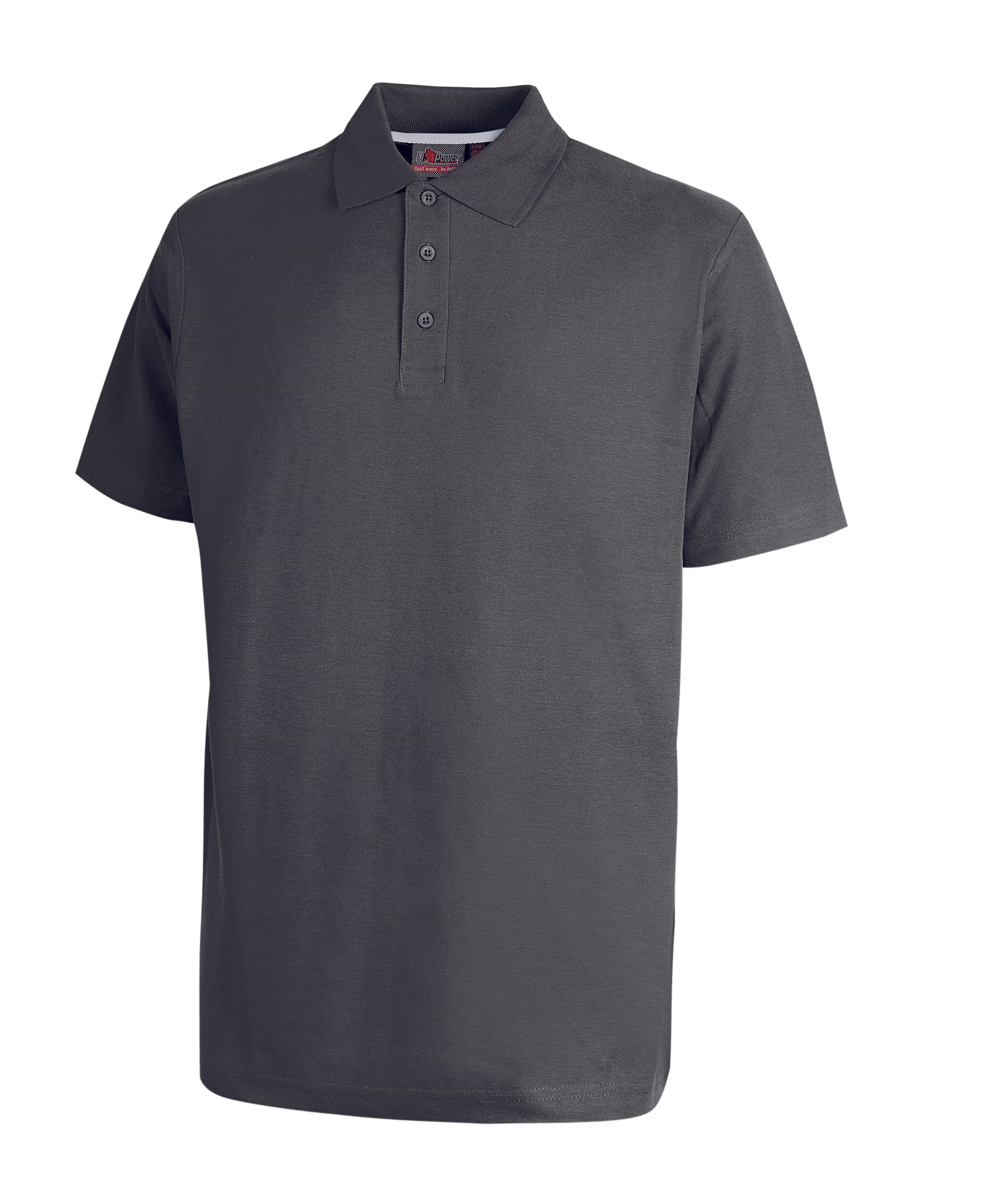 Polo 100% algodón, 200 g/m². Piqué. Manga corta, cuello canalé, abertura central con tres botones. Cubrecosturas reforzados en cuello y hombros. Color gris oscuro. Talla 2XL.