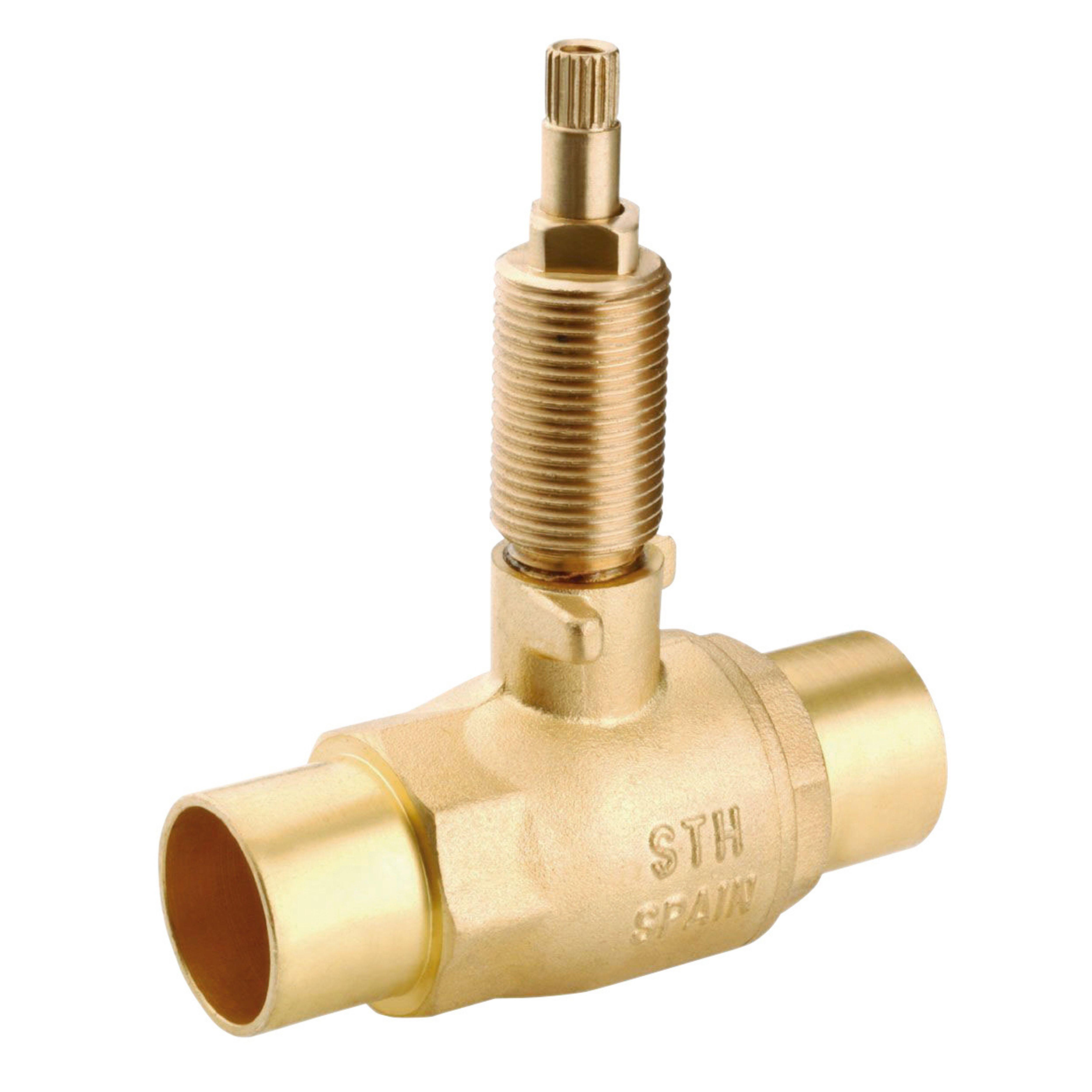 Válvula esfera de latón para empotrar, accionamiento manual, utilizada como llave de corte general de viviendas. Bocas hembra para soldar tubo de cobre Ø15mm.