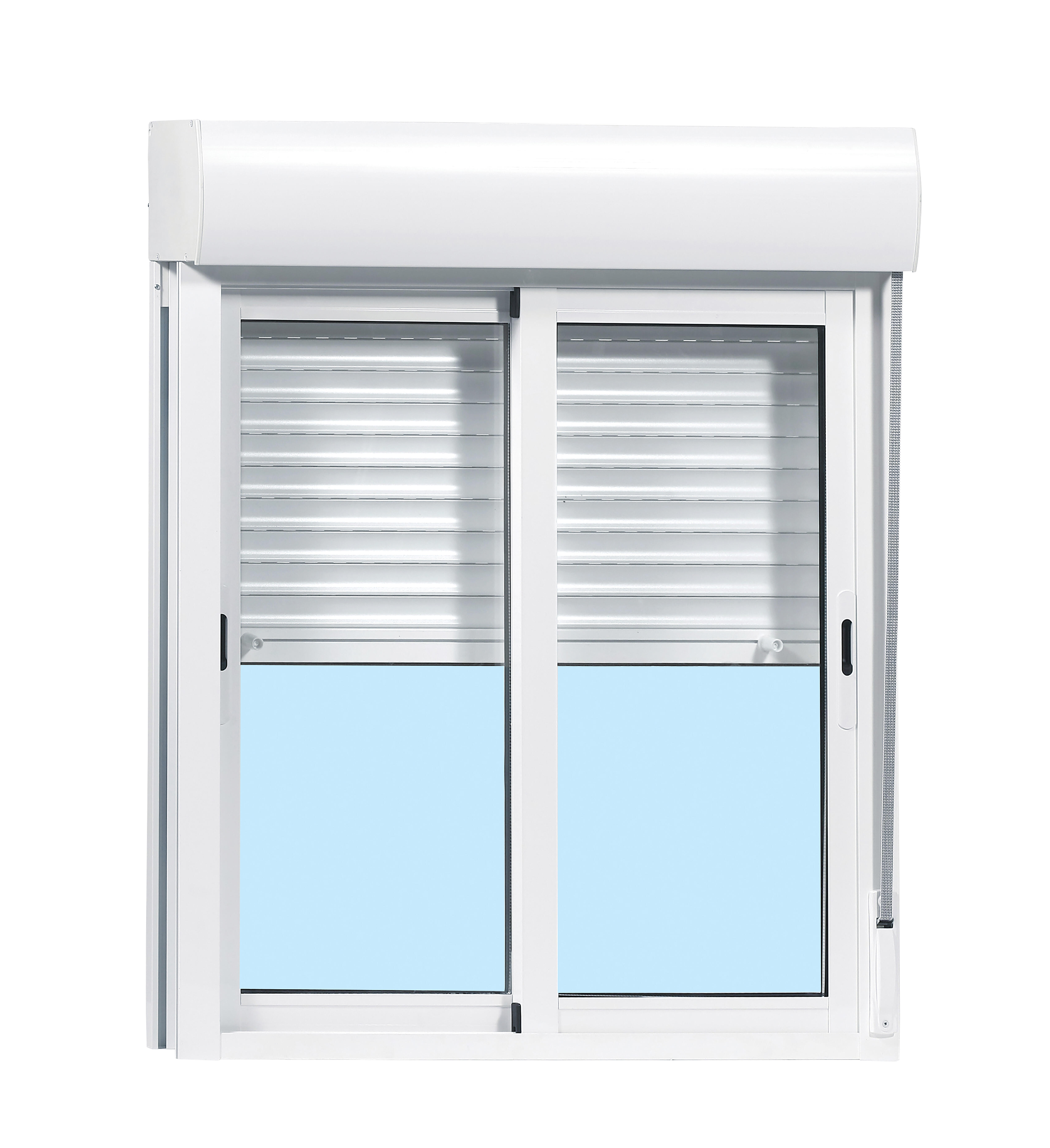 Ventana aluminio corredera con persiana incluida. Color blanco lacado QUALICOAT. Medidas 140x138cm. Perfil de 120mm y dispone de doble acristalamiento 4/8/4 tipo Climalit. Permeabilidad al aire Clase 2 y estanqueidad al agua Clase 5A.
