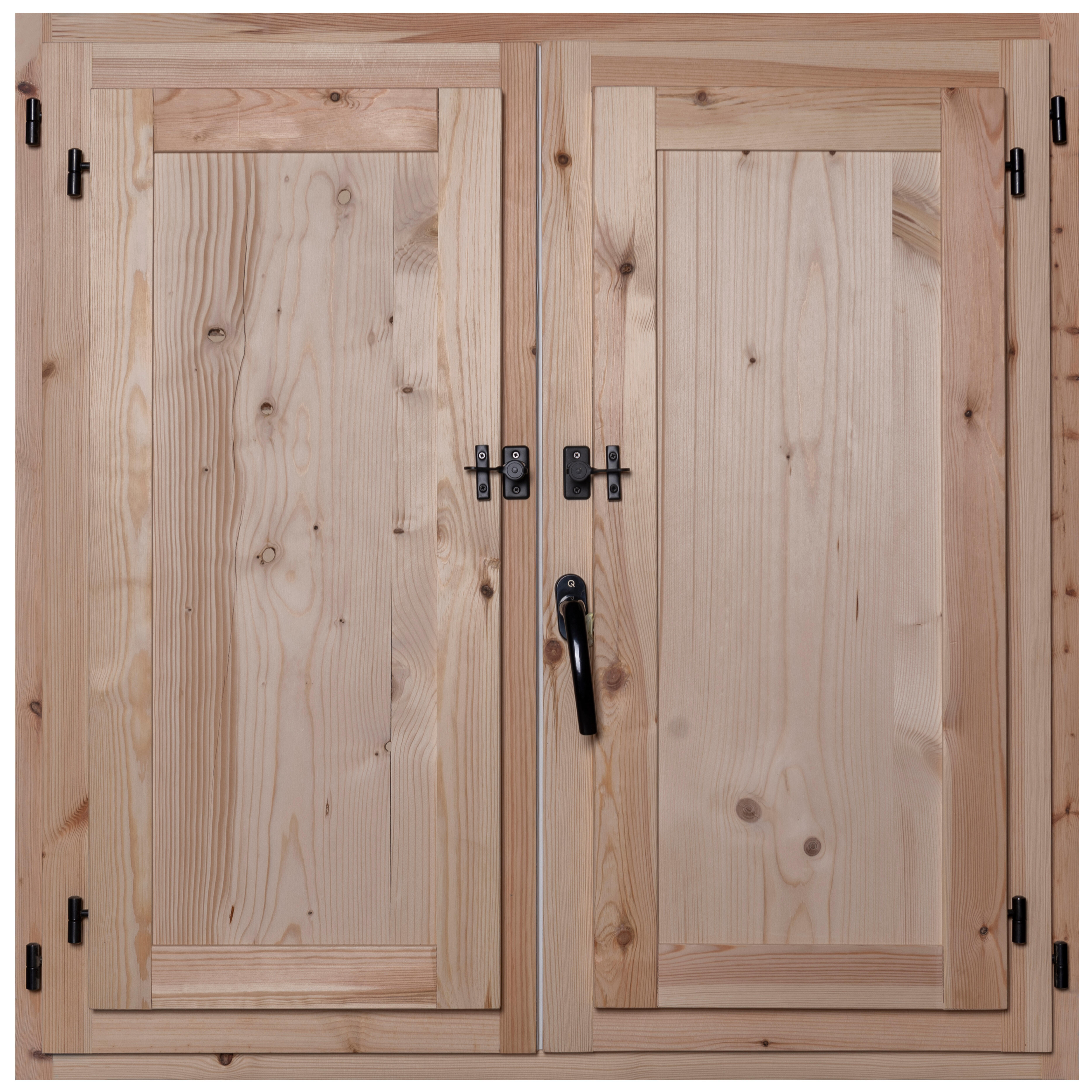 Ventana de madera de pino macizo con postigo incorporado. Medidas 100x100cm y perfil de 70mm. Doble vidrio con cámara 4-6-4 y cierre practicable.