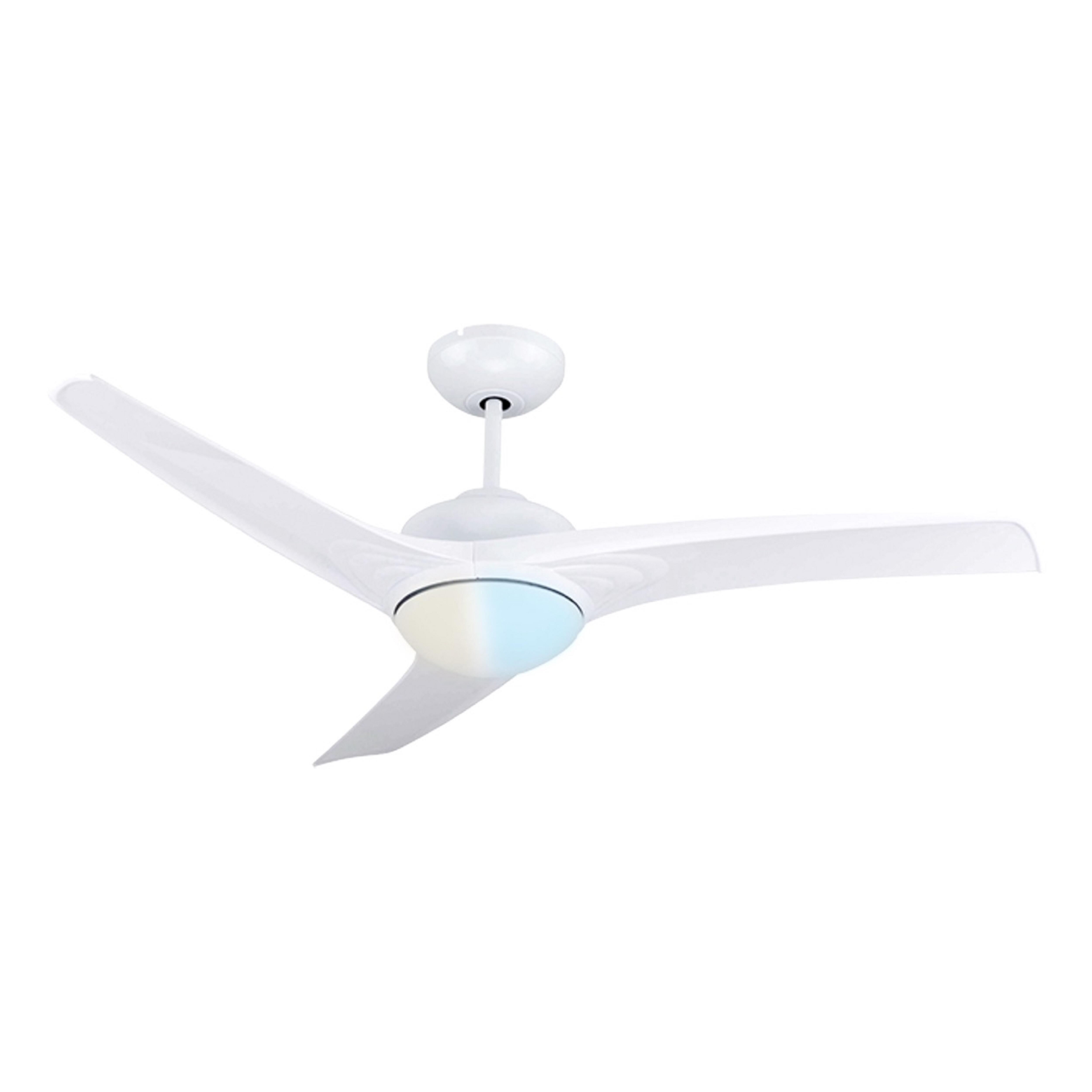 Ventilador para techo con luz. Diámetro 88cm y 3 aspas de ABS. Cuerpo de aluminio en acabado blanco. Motor DC ultrasilencioso. Plafón led de 18W, tipo de luz CCT y 1800 lumens. Control con mando a distancia, programable con 6 velocidades. Modo verano (giro natural) e invierno (giro inverso).Ventilador para techo con luz.