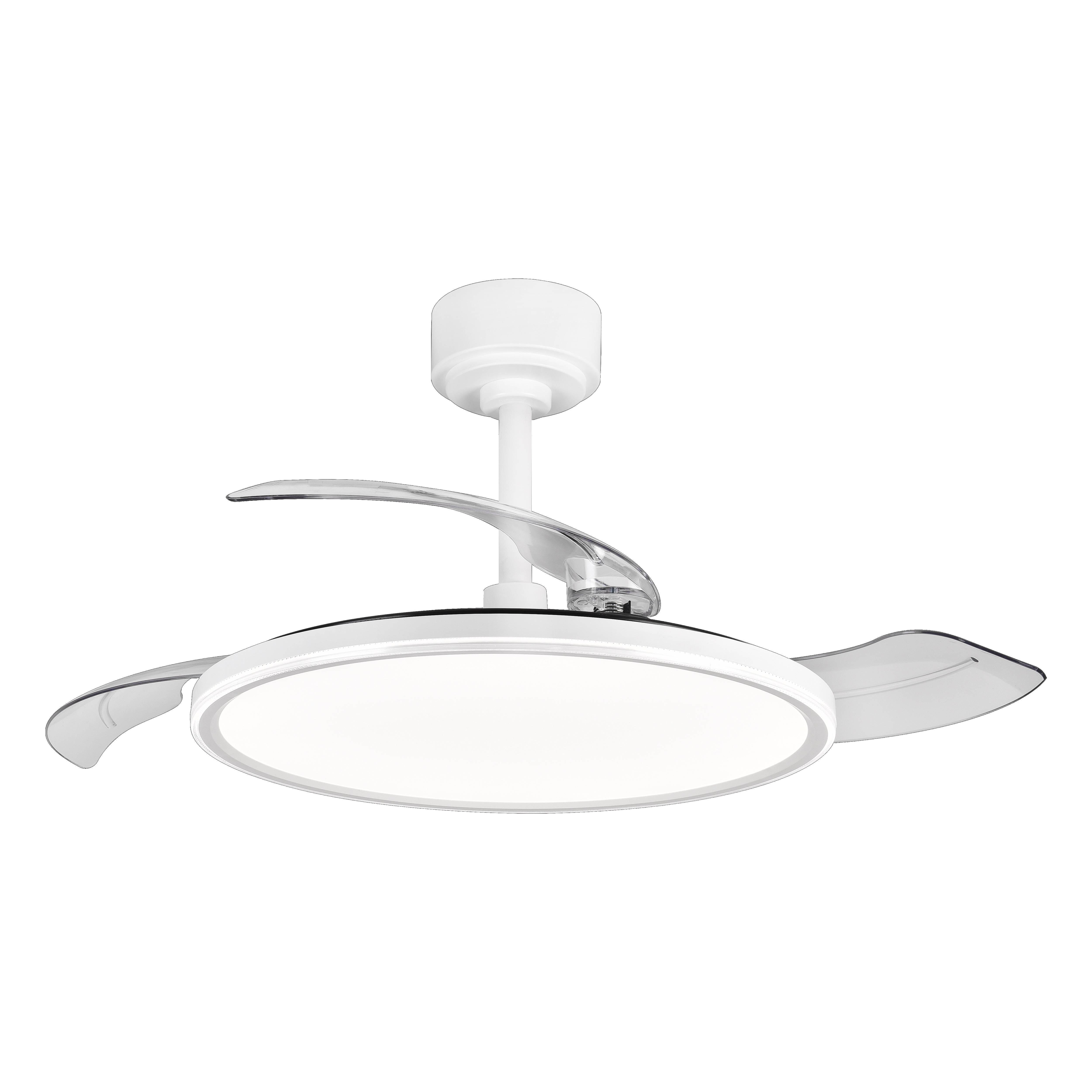 Ventilador para techo con luz. Diámetro 91cm y 3 palas retráctiles de PC transparente. Diseño elegante en acabado blanco. Motor DC ultrasilencioso con 6 velocidades, temporizador de 1h-2h y 4h.control con mando a distancia. Plafón led de 22W, tipo de luz CCT con 3 colores seleccionables (cálida, neutra y fría). Intensidad de luz regulable. Modo verano (natural) invierno (inverso).