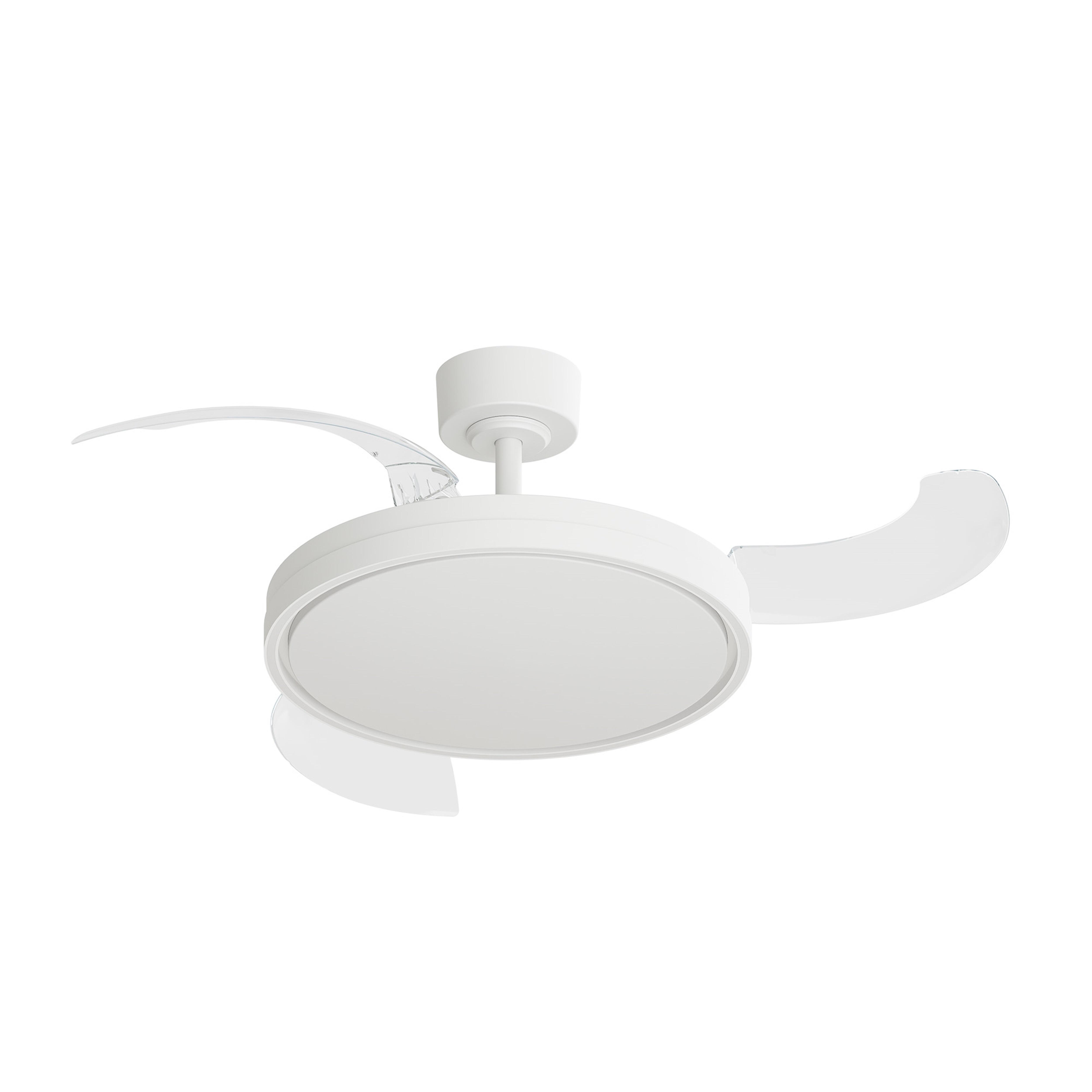 Ventilador para techo con luz. Diámetro 107cm y 3 palas retráctiles de PC transparente. Acabado blanco. Motor DC con 6 velocidades, modo brisa natural. Control con mando a distancia. Plafón led de 29W, tipo de luz CCT con 3 colores seleccionables (cálida, neutra y fría). Intensidad de luz regulable. Temporizador para apagado automático, función memoria para encendido desde el interruptor. Modo verano (giro natural) e invierno (giro inverso).