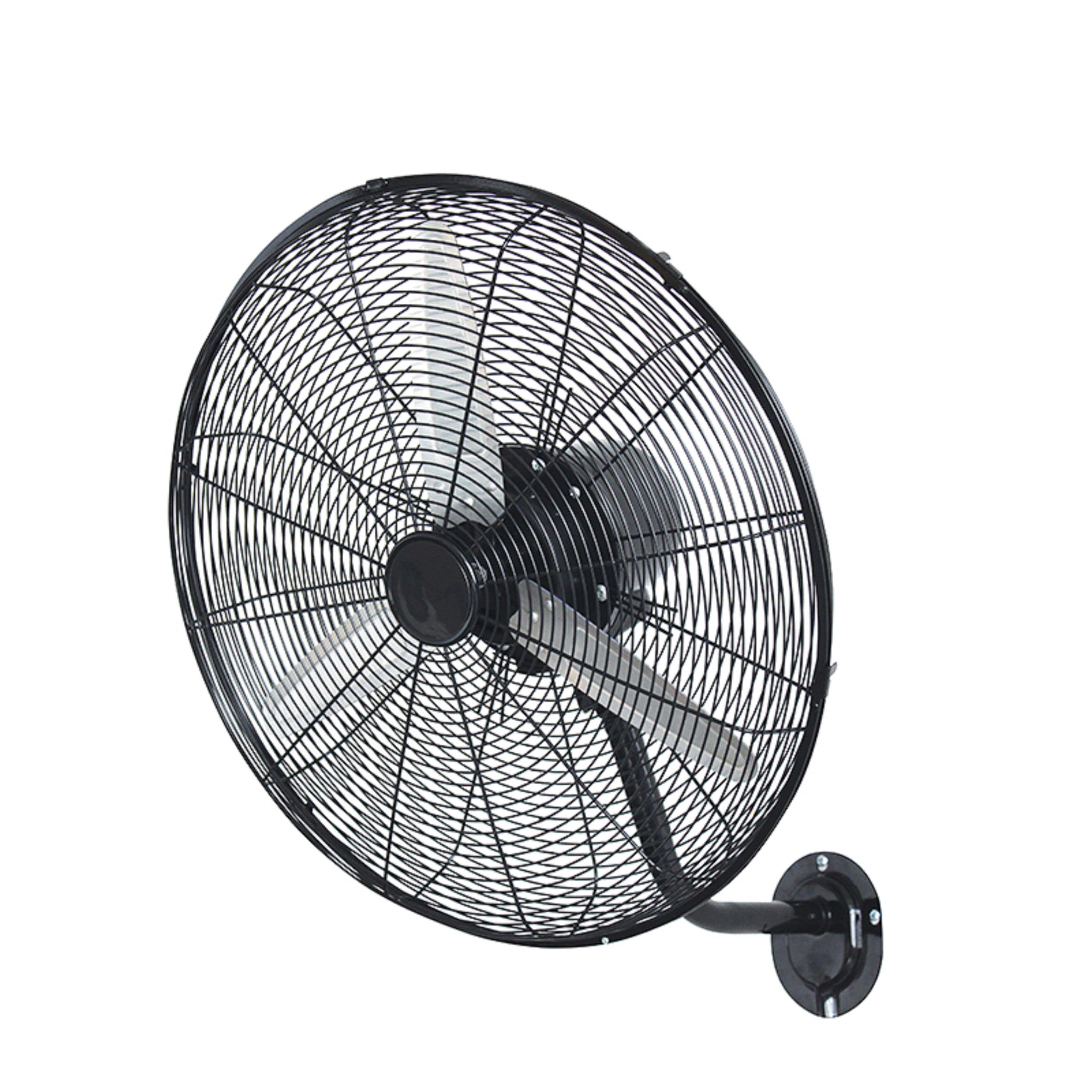 Ventilador de pared giratorio, diámetro 50cm, 3 aspas de aluminio. Potencia 120W. 3 velocidades de funcionamiento, Ángulo de inclinación ajustable. Acabado negro. Incluye tornillos y tuercas de fijación a pared.