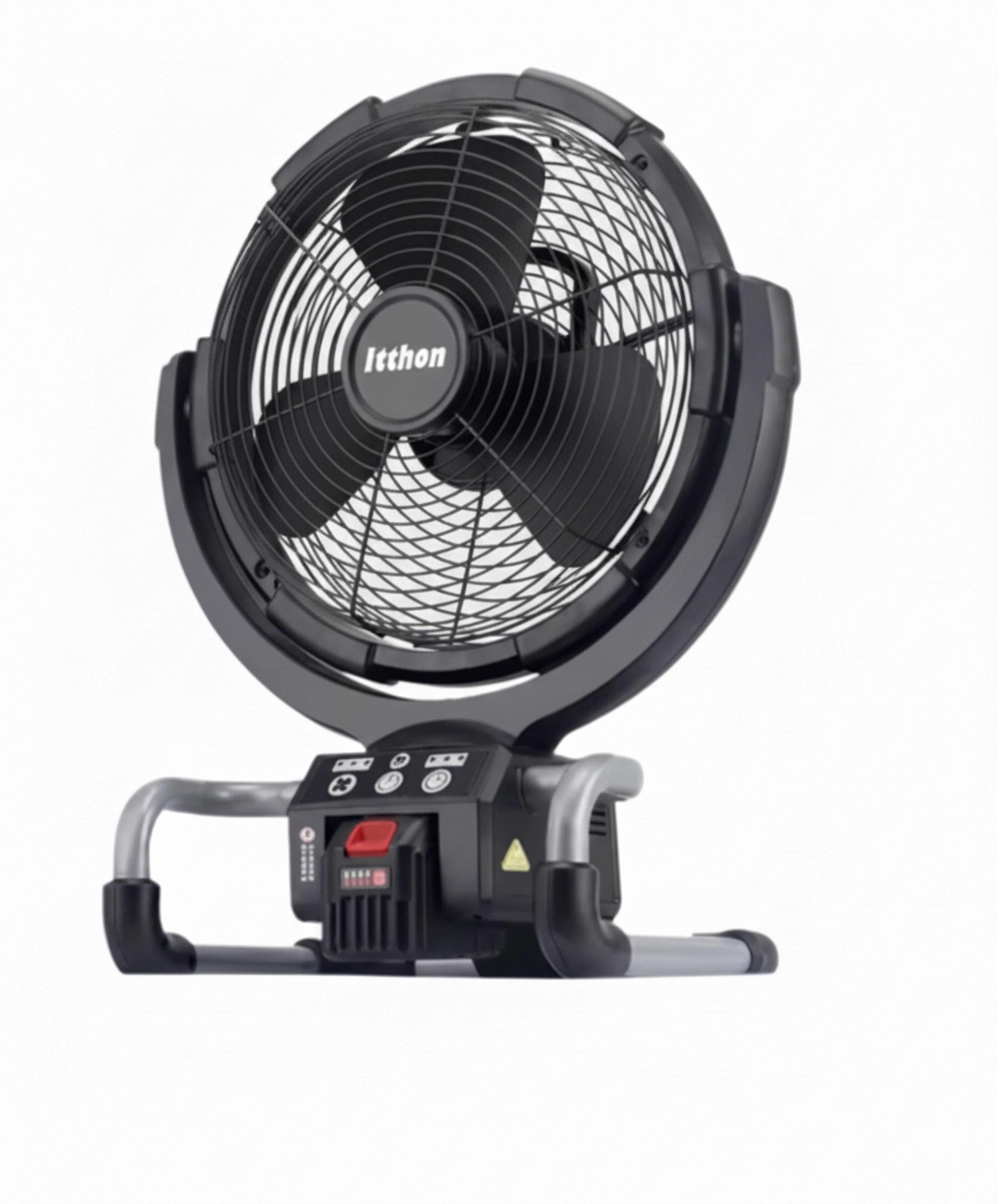 Ventilador portátil con batería recargable, diámetro 40cm. Batería Li-ion 21V-6.0Ah. Estructura metálica resistente. Ideal para exteriores, camping y talleres.