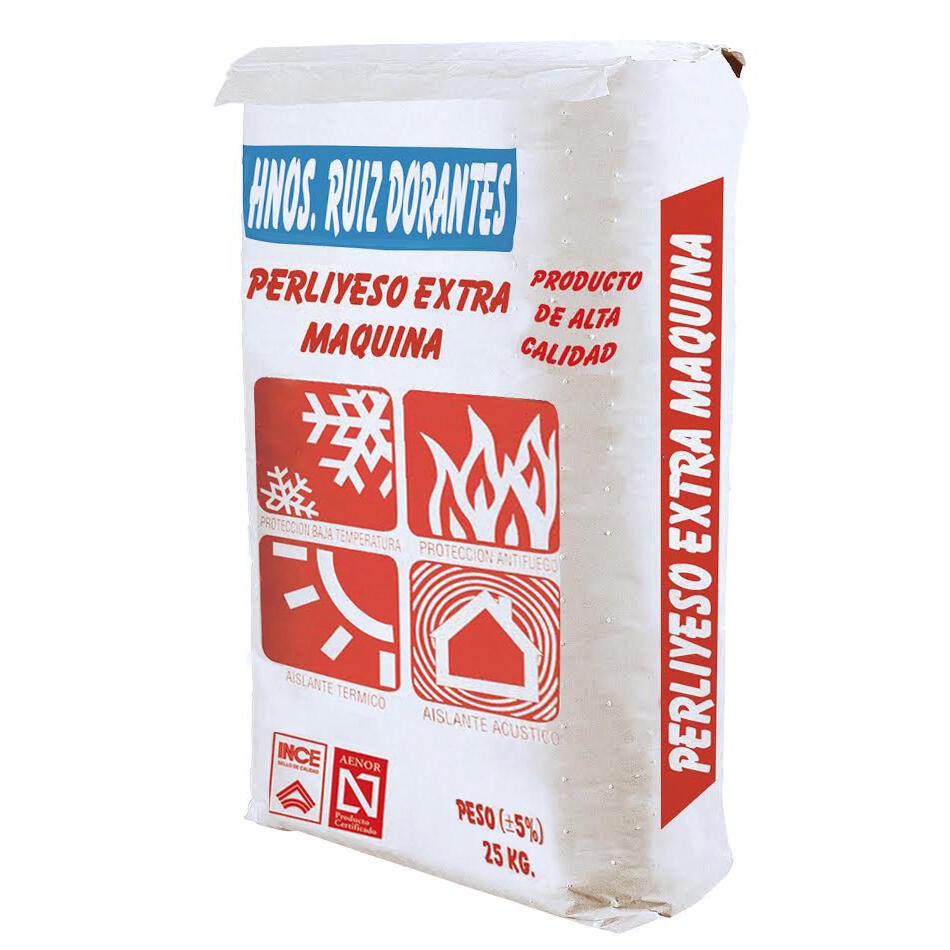 Yeso de base escayola aligerado con perlita PERLIYESO EXTRA. Destinado para revestimientos de interior tanto horizontales como verticales. Aplicación mecánica con alta cualidad térmica y acústica debido a la incorporación de minerales ligeros. Saco de 25 kg.